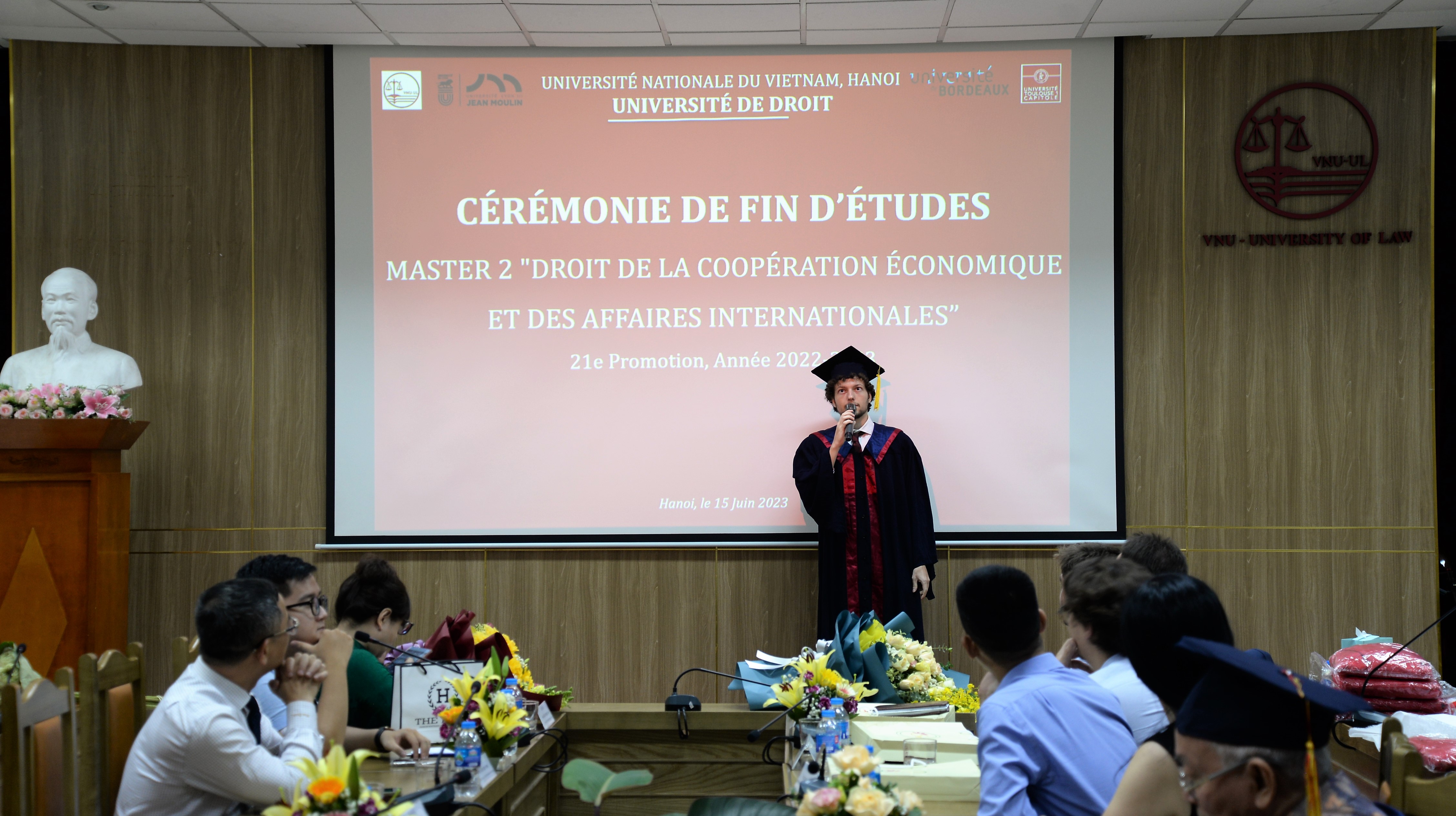 Bằng Thạc sĩ “Luật Hợp tác kinh tế và Kinh doanh quốc tế” (Master Droit de la coopération économique et des affaires internationales) do các trường đại học hàng đầu của Cộng hòa Pháp (Đại học Jean Moulin Lyon 3, Đại học Bordeaux và Đại học Toulouse 1 Capitole) luân phiên cấp. Khóa năm học 2023-2024 sẽ do Đại học Bordeaux, Cộng hòa Pháp cấp bằng.