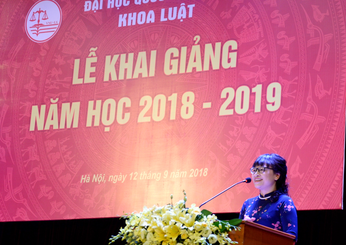 Phát biểu khai giảng năm học mới, PGS.TS. Nguyễn Thị Quế Anh gửi lời chúc mừng đến 522 tân sinh viên đã chọn Khoa Luật là nơi trải nghiệm những tháng năm đẹp đẽ nhất của cuộc đời thanh xuân và tin rằng các bạn tân sinh viên sẽ phát huy nhiệt huyết của tuổi trẻ, say mê trong học tập, rèn luyện, phấn đấu thể hiện trách nhiệm của sinh viên Khoa Luật, ĐHQGHN để tiếp nối truyền thống vẻ vang của các cựu sinh viên đi trước và không phụ lòng tin yêu, sự hi sinh thầm lặng của các thầy cô, của các bậc phụ huynh. PGS.TS. Nguyễn Thị Quế Anh cũng nhấn mạnh, với xu thế phát triển và đổi mới giáo dục đại học hiện nay, năm học 2018 – 2019, Khoa Luật, ĐHQGHN sẽ tập trung vào xây dựng phát triển trở thành trường đại học thành viên của ĐHQGHN, đổi mới và từng bước thực hiện quản trị tiên tiến, tiến tới tự chủ đại học, chú trọng phát triển đội ngũ cán bộ, xây dựng môi trường văn hóa học đường hướng tới sinh viên và nâng cao chất lượng các mặt hoạt động.