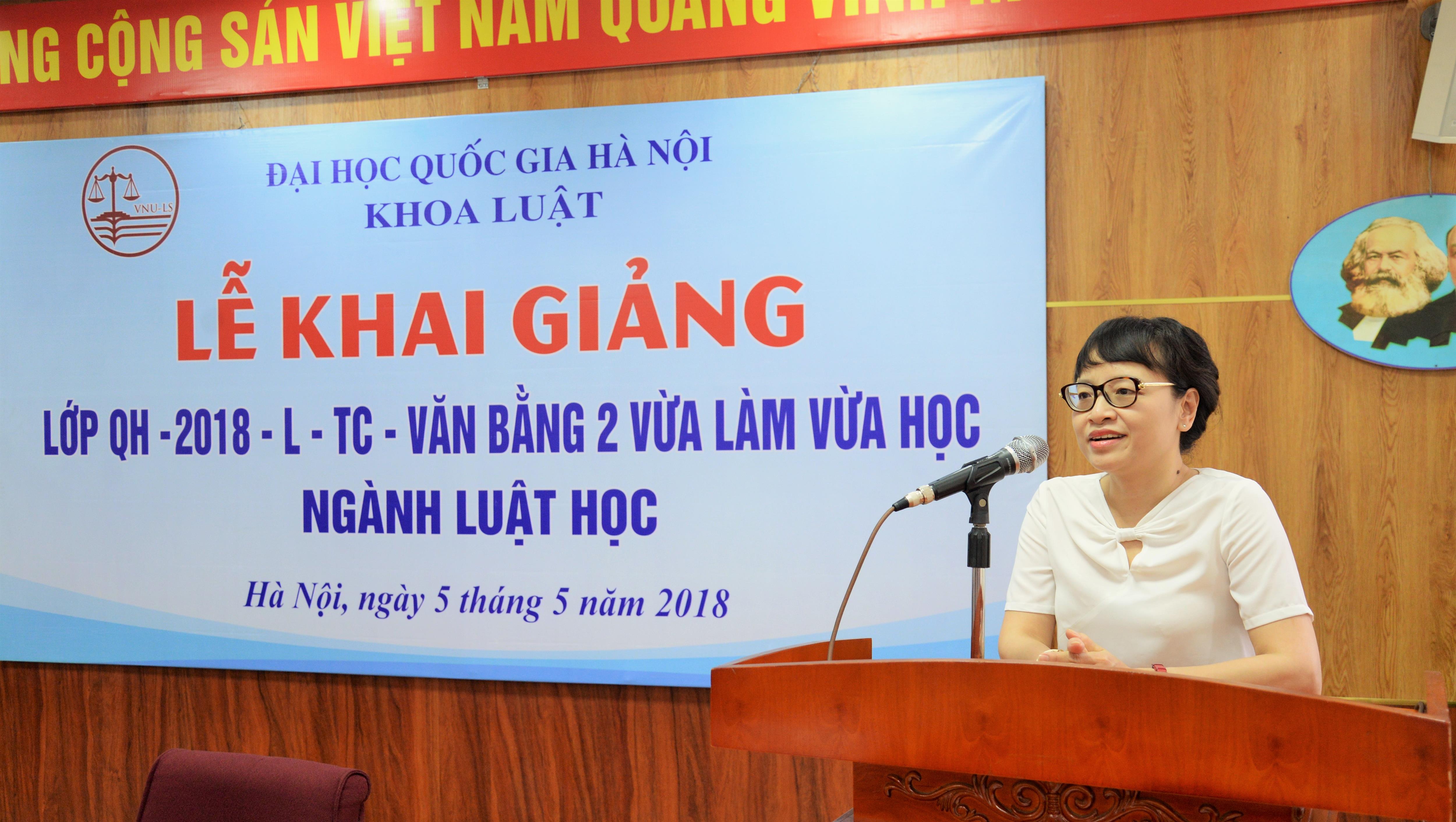 Phát biểu tại buổi Lễ, PGS.TS. Nguyễn Thị Quế Anh chúc mừng các tân học viên lớp Văn bằng 2 VLVH năm 2018 đã chính thức trở thành thành viên của Khoa Luật, ĐHQGHN, đồng thời, mong muốn các học viên của lớp Văn bằng 2 VLVH năm 2018 sẽ có khóa học đạt kết quả tốt, góp phần nâng cao trình độ chuyên môn, kiến thức pháp lý để phục vụ hiệu quả cho công việc, đóng góp nhiều hơn nữa cho đơn vị nơi các học viên công tác và trở thành thành viên tích cực trong tất cả các lĩnh vực liên quan đến hoạt động pháp lý.