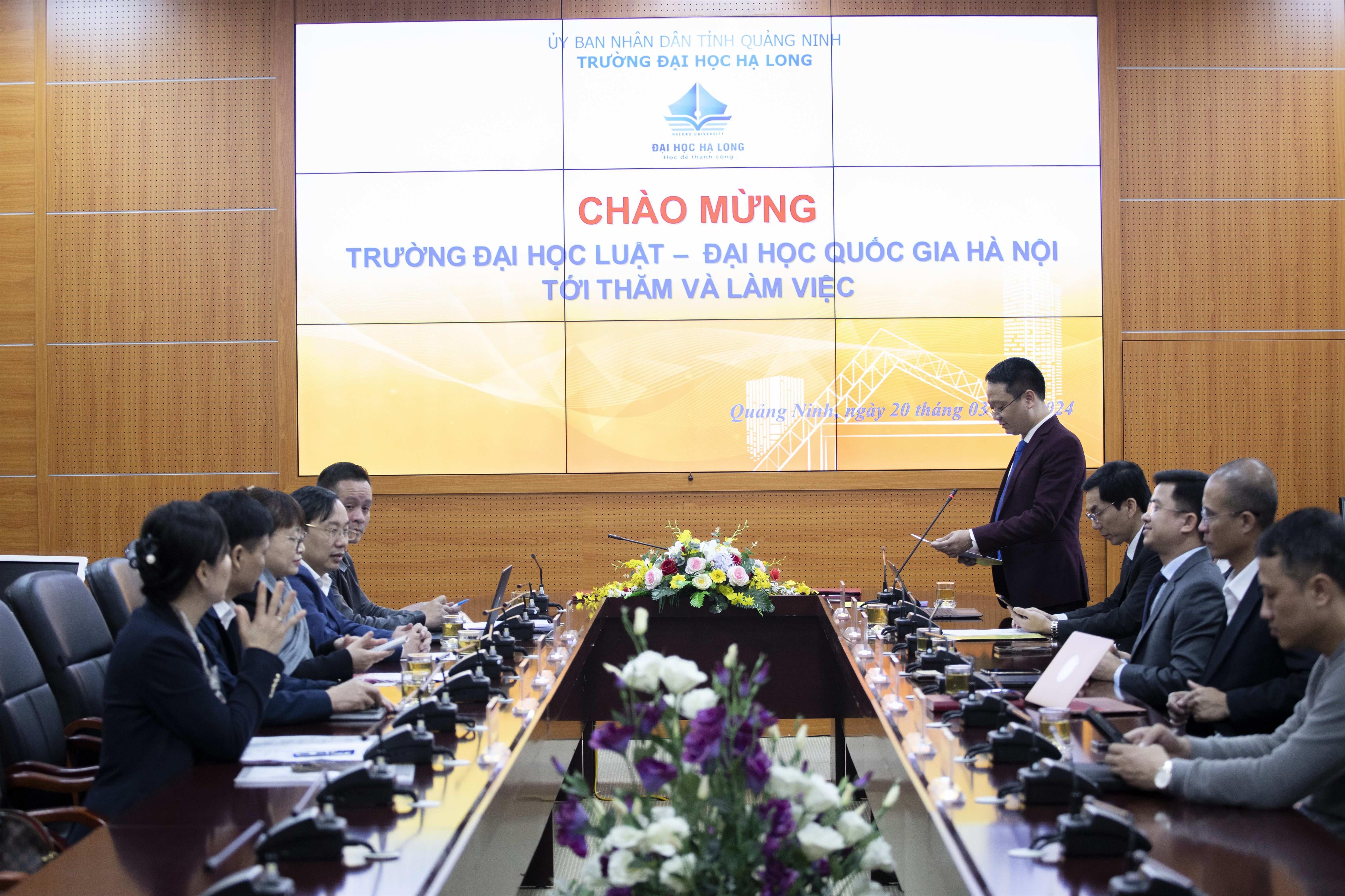 Tại buổi làm việc, TS. Nguyễn Đức Tiệp – Hiệu trưởng Trường Đại học Hạ Long đã bày tỏ vui mừng khi được đón tiếp đoàn công tác của Trường Đại học Luật, ĐHQGHN đến thăm và làm việc tại Trường. Đồng chí Hiệu trưởng đã giới thiệu với đoàn quá trình thành lập, xây dựng và phát triển cũng như các lĩnh vực đào tạo, nghiên cứu khoa học và mạng lưới hợp tác của Trường Đại học Hạ Long.