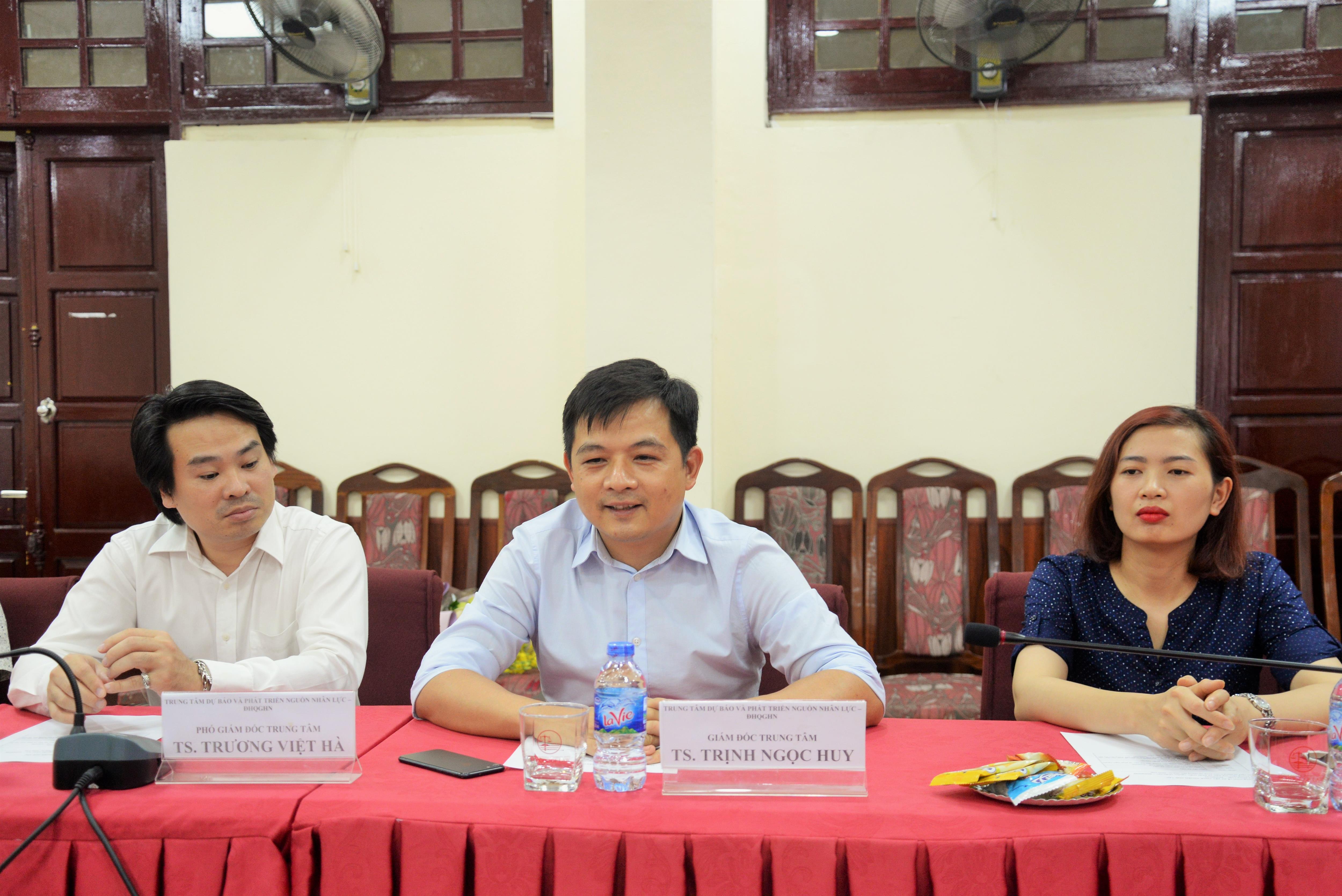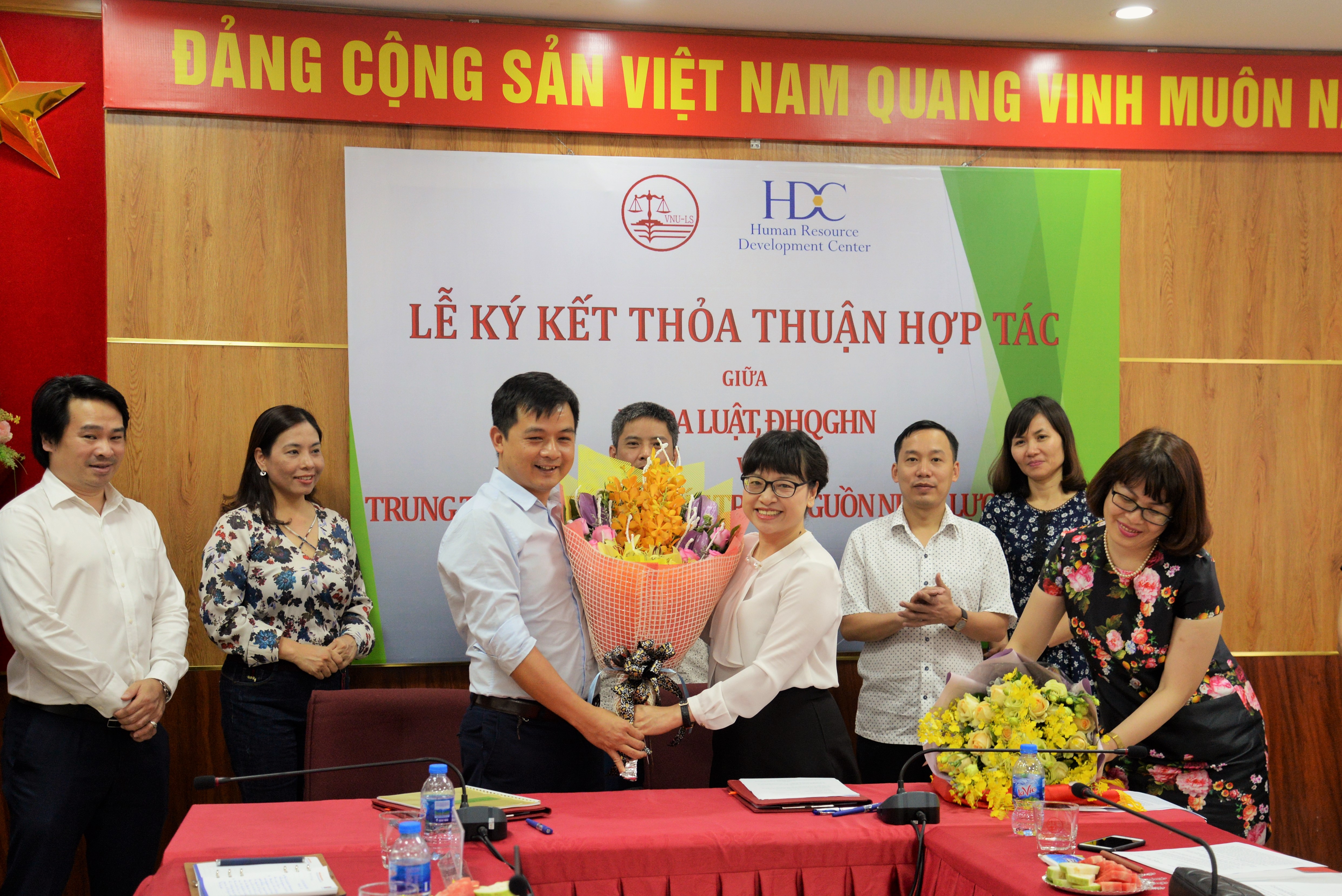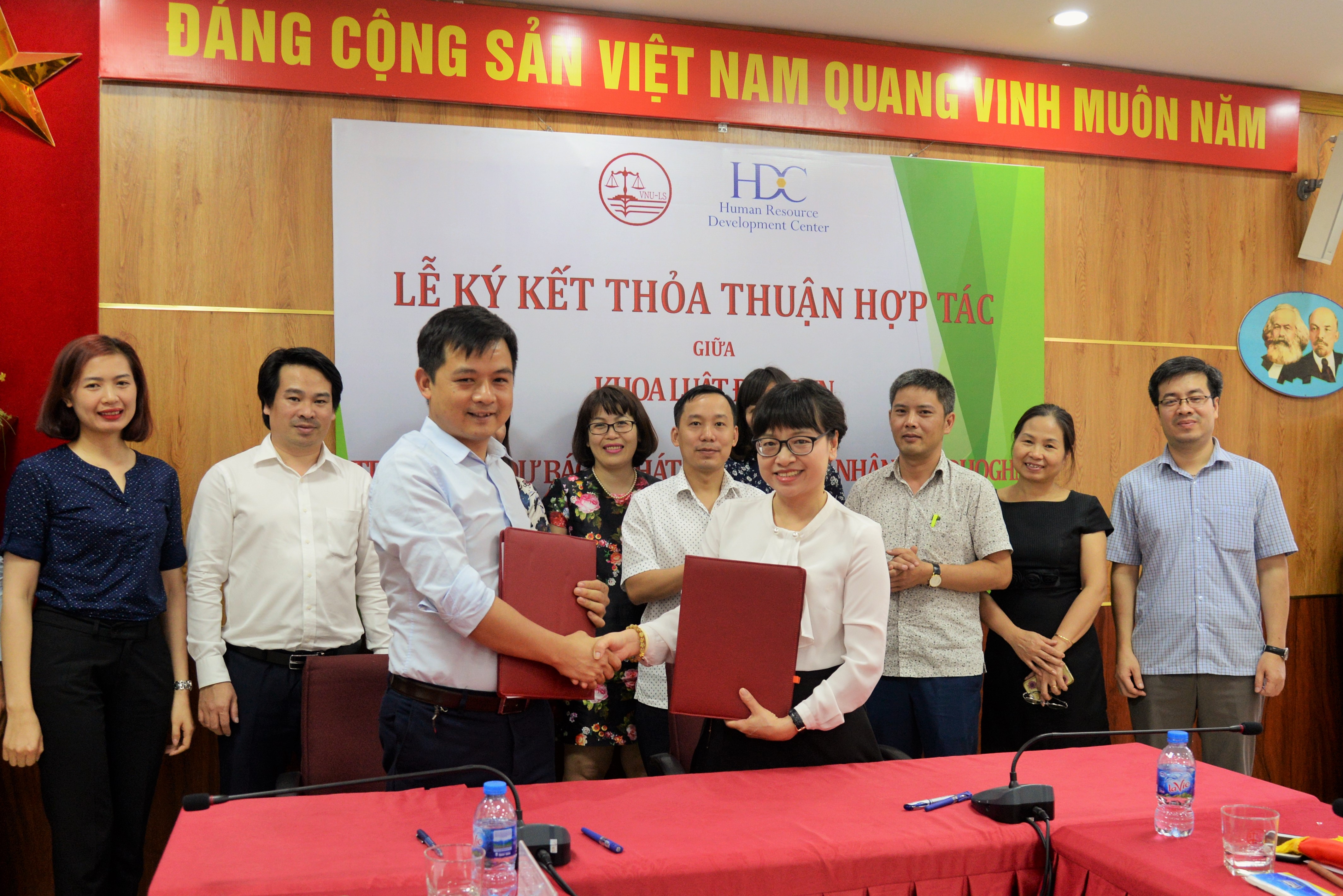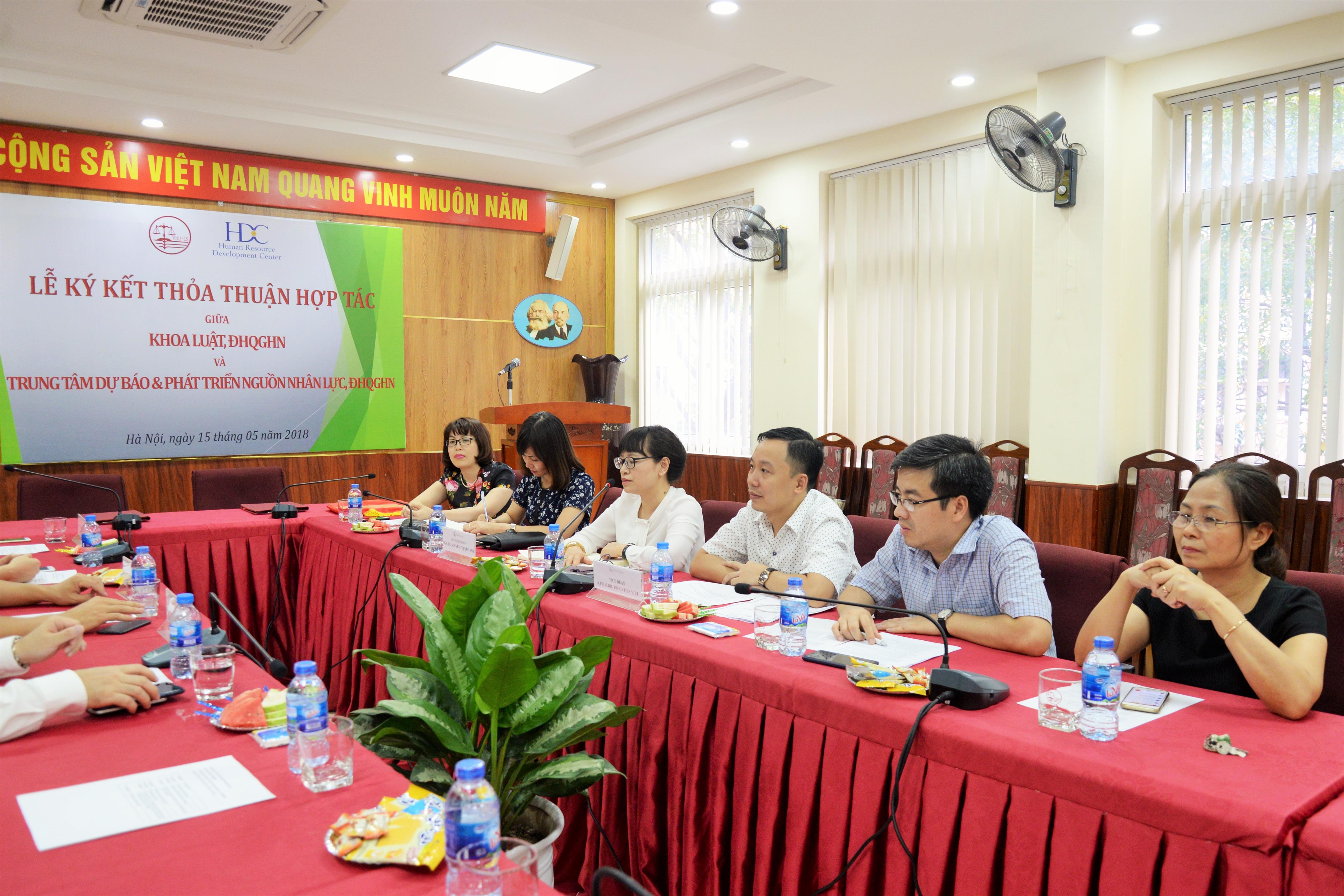 Ngày 15/5/2018, Khoa Luật, Đại học Quốc gia Hà Nội (ĐHQGHN) tổ chức Lễ ký thỏa thuận hợp tác giữa Khoa Luật và Trung tâm Dự báo và Phát triển nguồn nhân lực, ĐHQGHN. Tới dự buổi Lễ, về phía Trung tâm Dự báo và Phát triển nguồn nhân lực, ĐHQGHN có TS. Trịnh Ngọc Huy – Giám đốc Trung tâm, TS. Trương Việt Hà – Phó Giám đốc Trung tâm, ThS. Đỗ Thu Hà – Trưởng phòng Đào tạo và Bồi dưỡng nguồn nhân lực; về phía Khoa Luật có PGS.TS. Nguyễn Thị Quế Anh – Chủ nhiệm Khoa Luật, PGS.TS. Trịnh Tiến Việt – Phó Chủ nhiệm Khoa, TS. Trần Thu Hạnh – Trưởng Phòng ĐT&CTHSSV, ThS. Nguyễn Văn Công – Trưởng Phòng Tổ chức Hành chính, TS. Mai Văn Thắng – Phó Trưởng Phòng QLKH&HTPT, TS. Lê Lan Chi – Phụ trách Bộ phận Liên kết đào tạo quốc tế và Đ/c Vũ Thị Hạnh – Phụ trách Bộ phận Kế hoạch Tài chính.