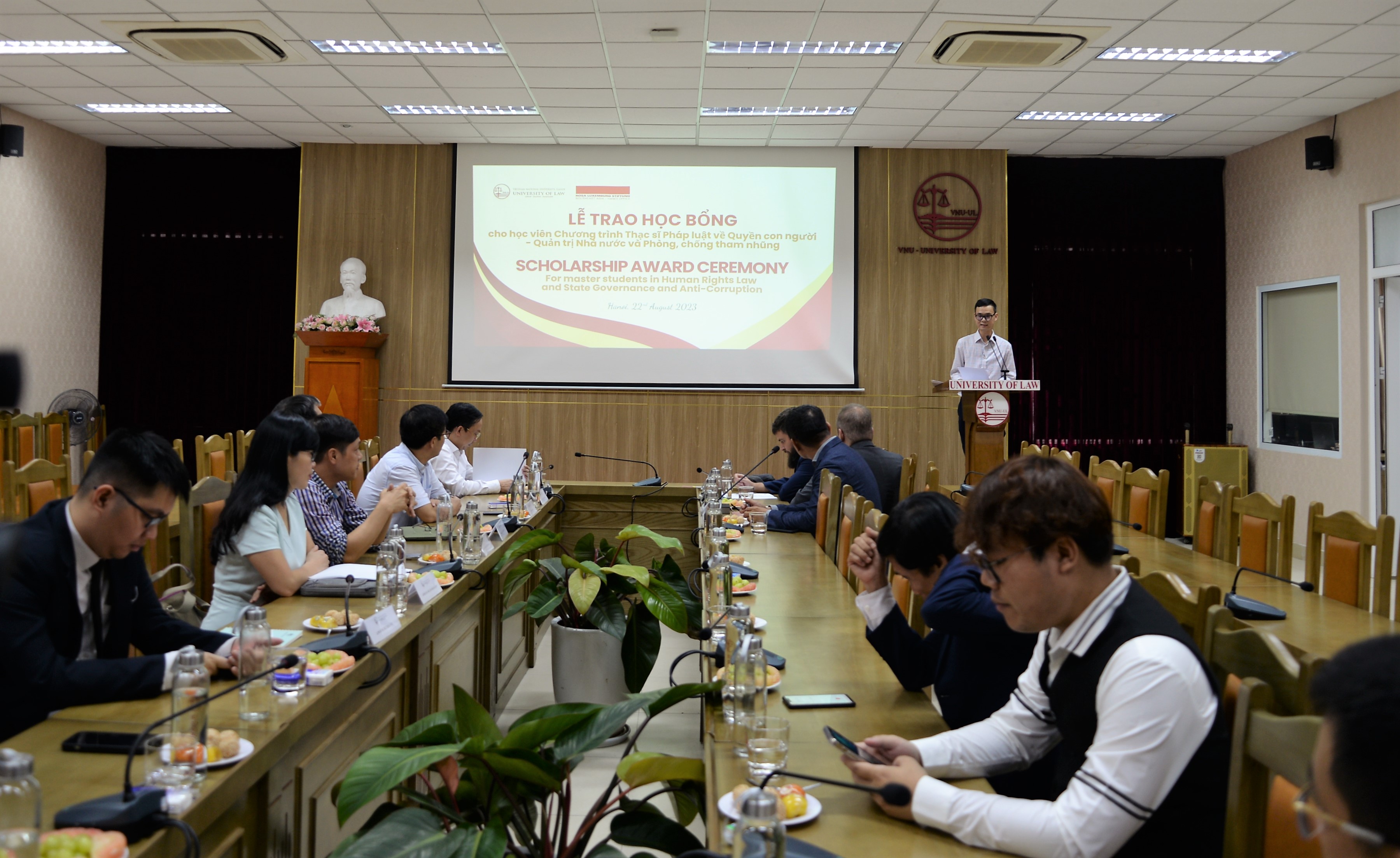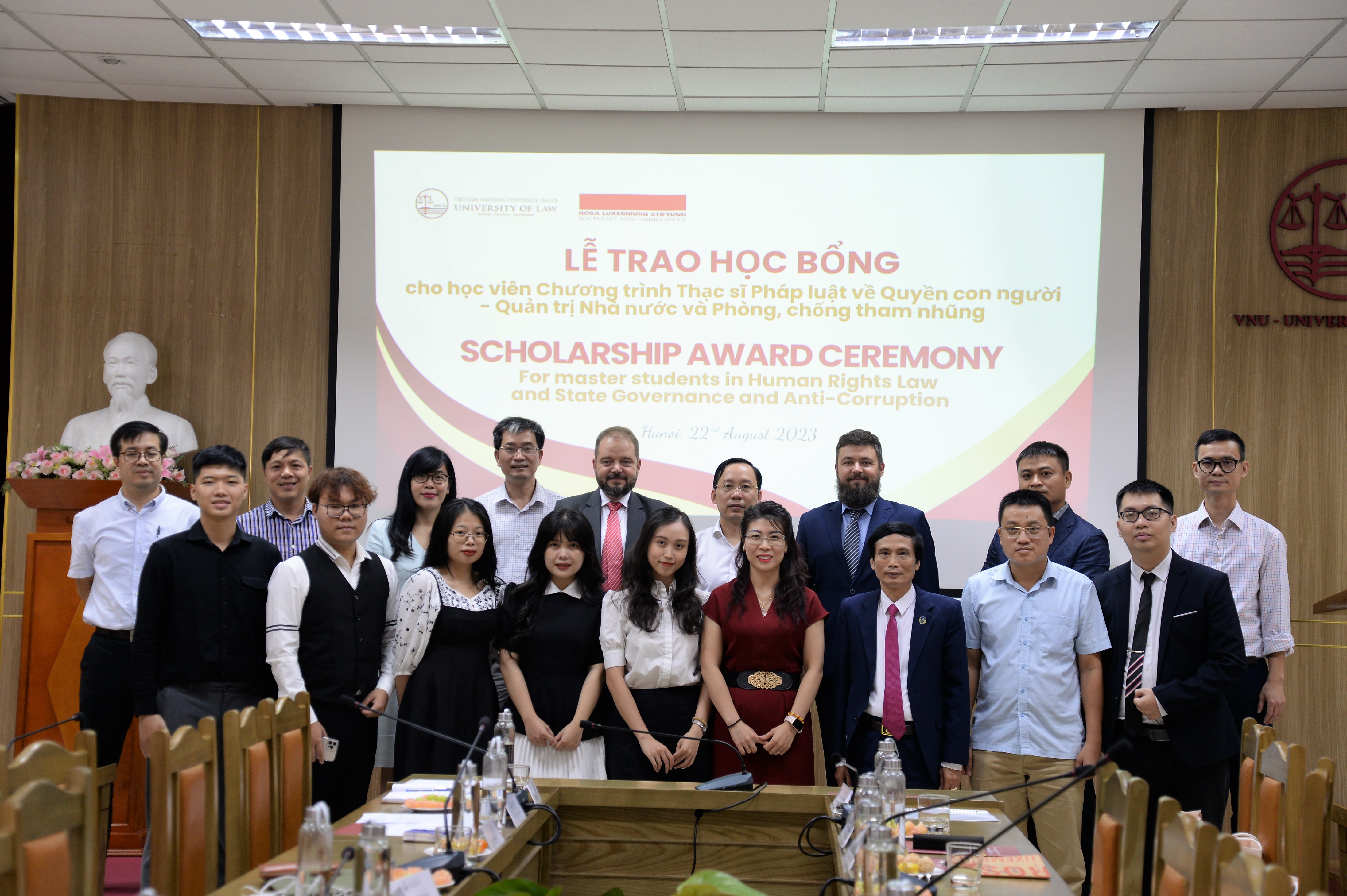 Chiều ngày 22/8/2023, Trường Đại học Luật, ĐHQGHN tổ chức Lễ trao học bổng cho học viên Chương trình Thạc sĩ Pháp luật về Quyền con người và Quản trị Nhà nước và Phòng, chống tham nhũng (QTNN&PCTN).