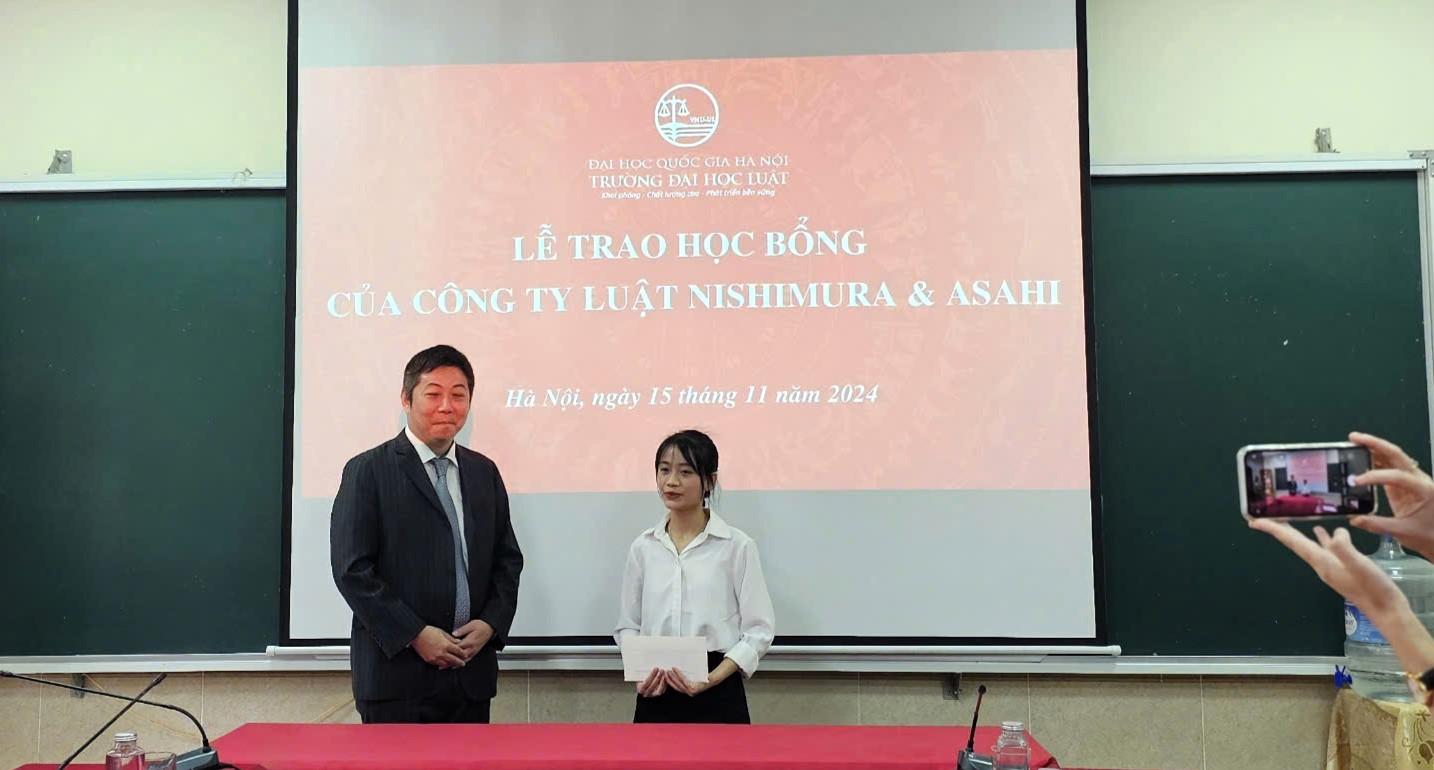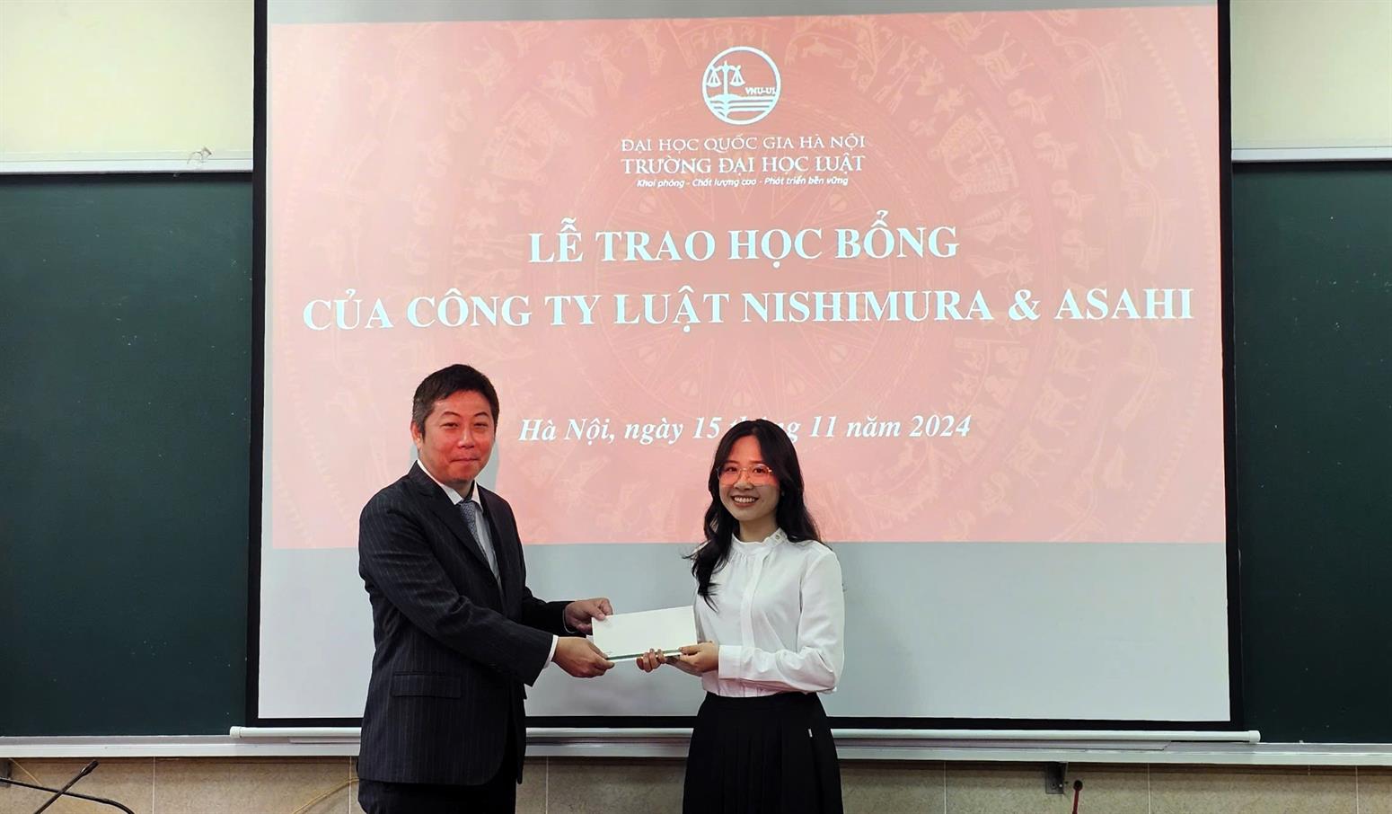 Ngày 15/11/2024, Trường Đại học Luật, ĐHQGHN đã tổ chức Lễ trao học bổng công ty Luật Nishimura& Asahi cho 02 sinh viên có hoàn cảnh khó khăn đạt thành tích cao trong học tập. Giá trị mỗi suất học bổng là 500USD (tương đương khoảng 12 triệu VNĐ).