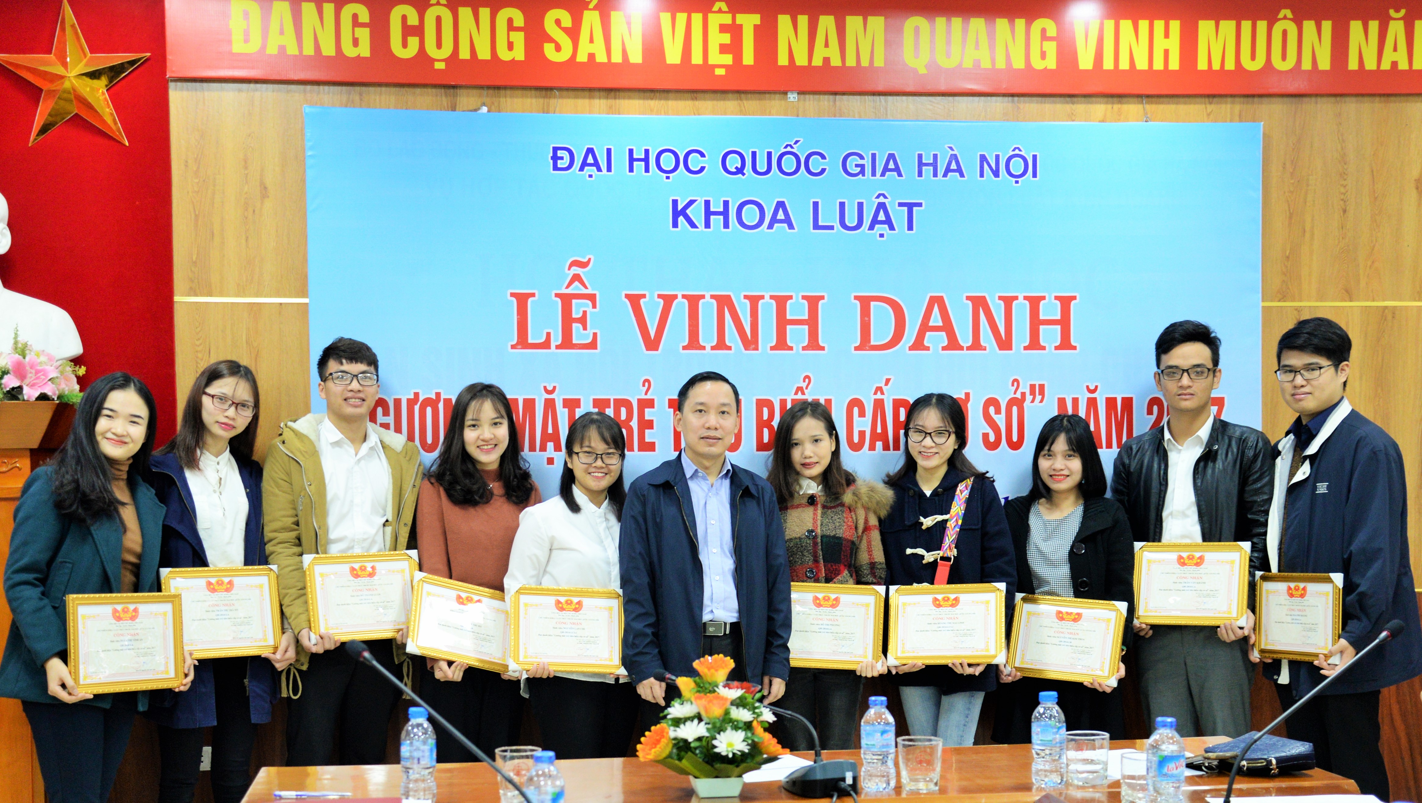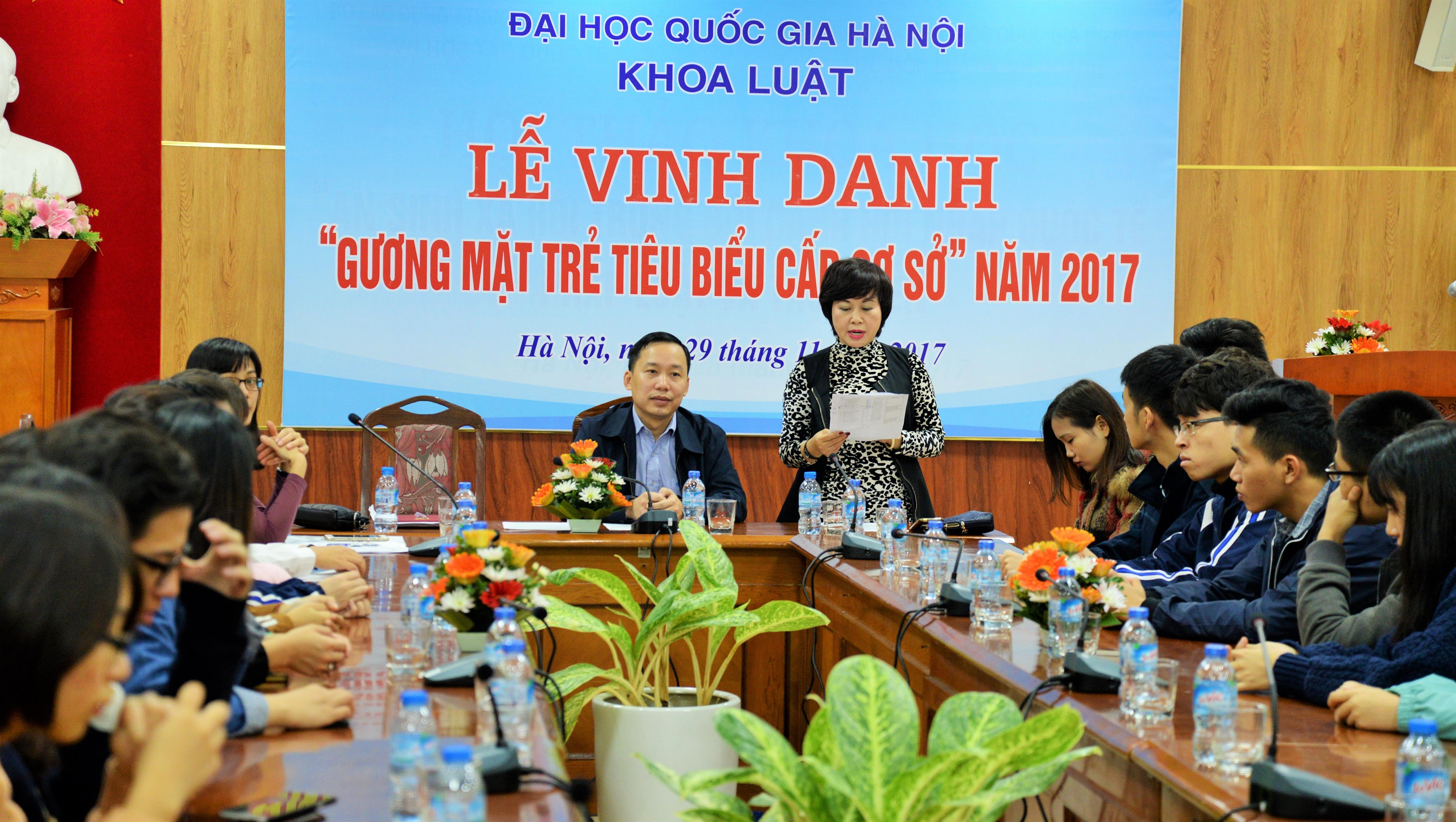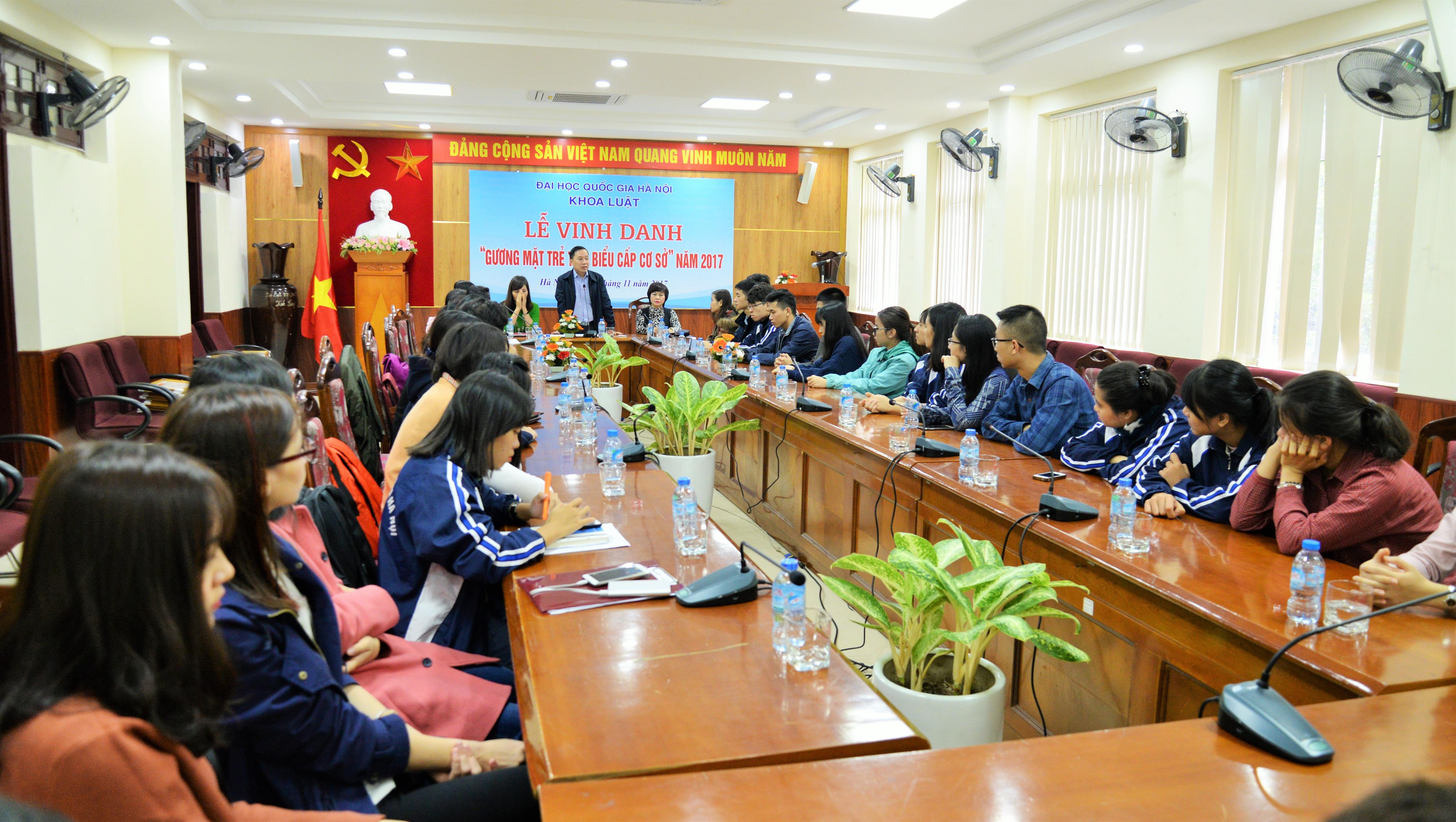 Sáng ngày 29/11/2017, Khoa Luật đã trang trọng tổ chức Lễ vinh danh “Gương mặt trẻ tiêu biểu cấp cơ sở” năm 2017. Tới dự buổi Lễ có TS. Trịnh Tiến Việt – Phó Bí thư Đảng ủy, Phó Chủ nhiệm Khoa, TS. Trần Thu Hạnh – Trưởng phòng Đào tạo và CTHSSV, Chủ tịch Công đoàn Khoa, ThS. Đỗ Thị Bích Nguyệt – Phó Trưởng phòng Đào tạo và CTHSSV cùng các gương mặt sinh viên ưu tú, tiêu biểu nhất có kết quả học tập và rèn luyện xuất sắc trong năm học 2016 – 2017.