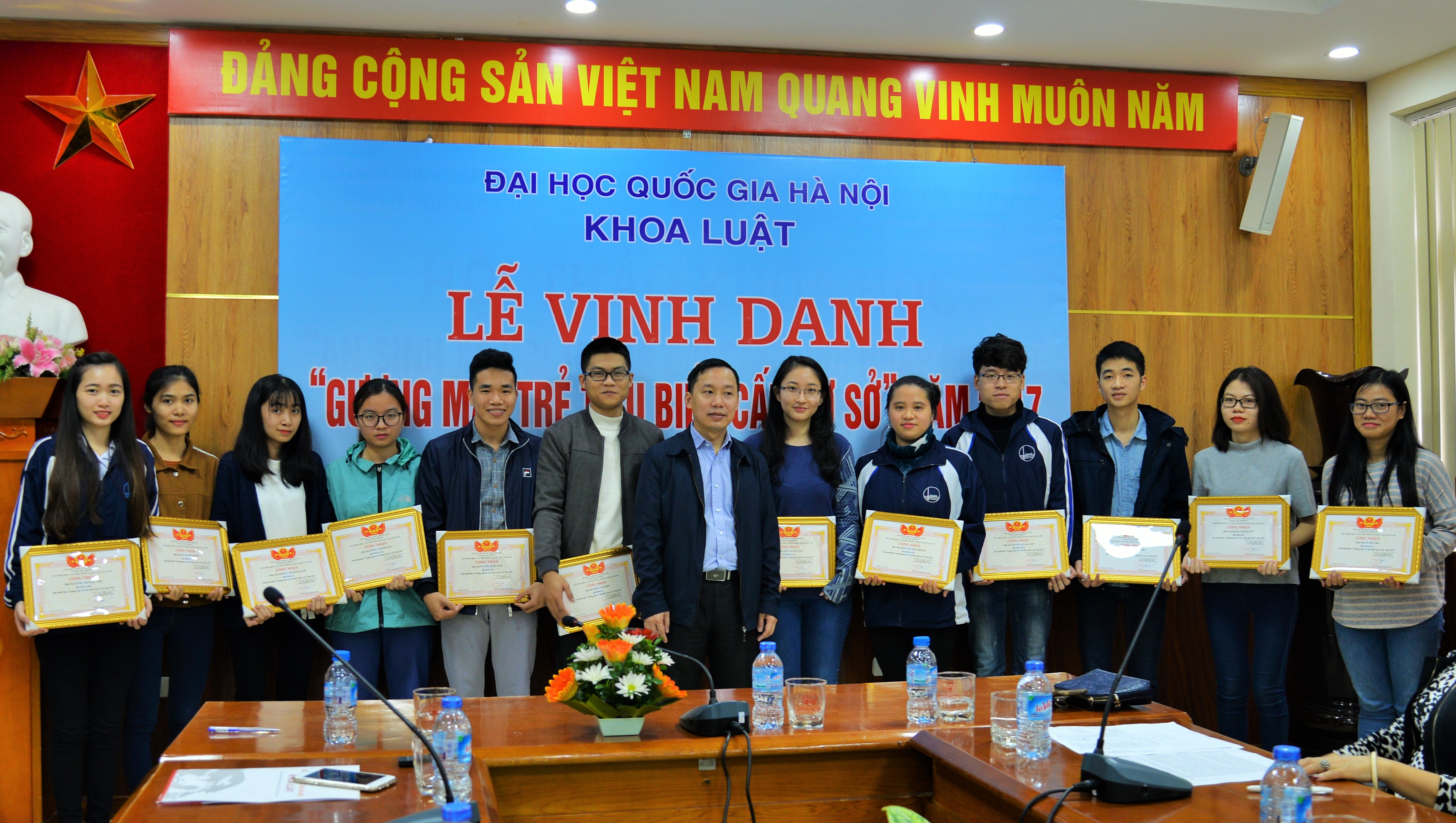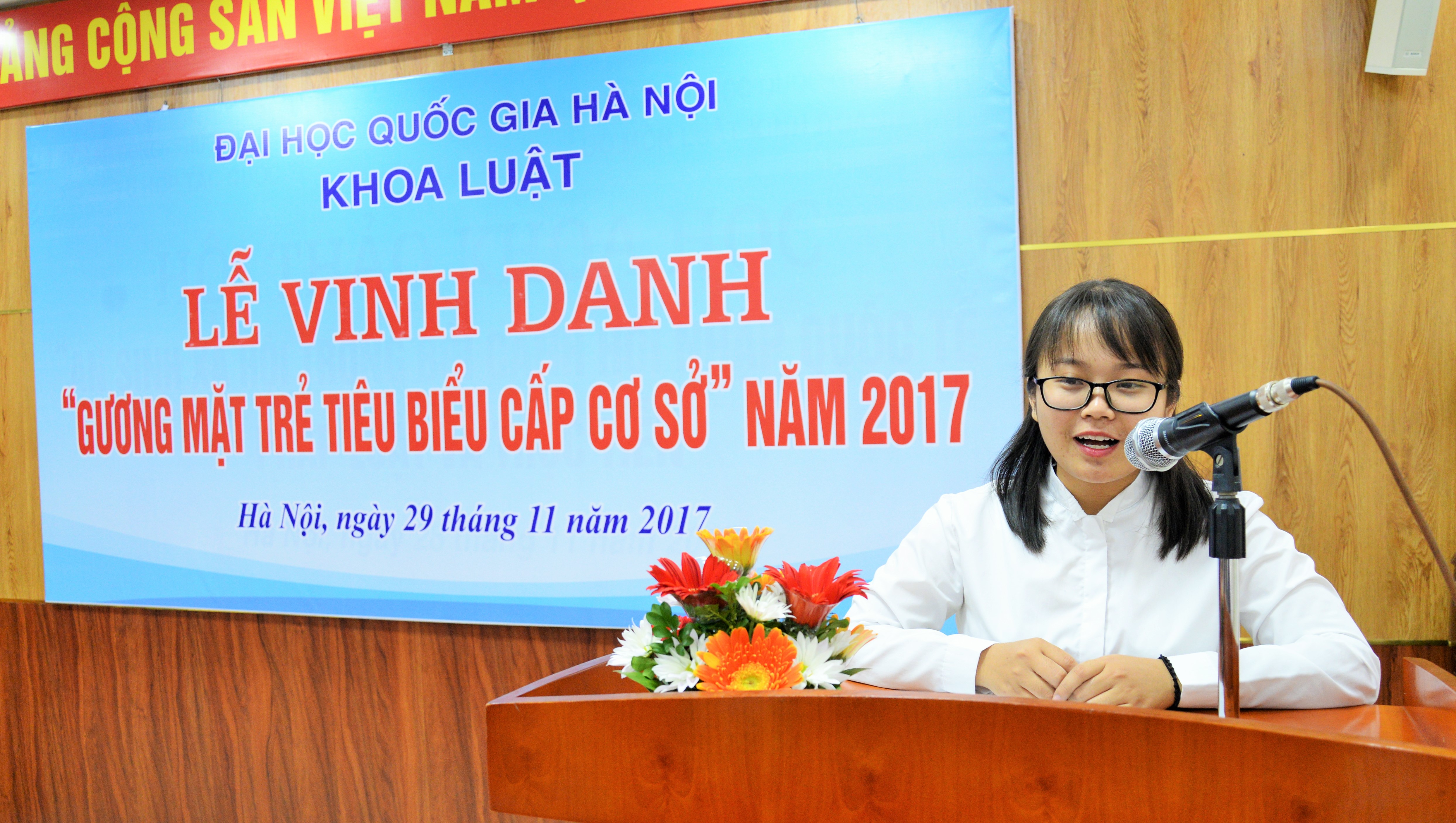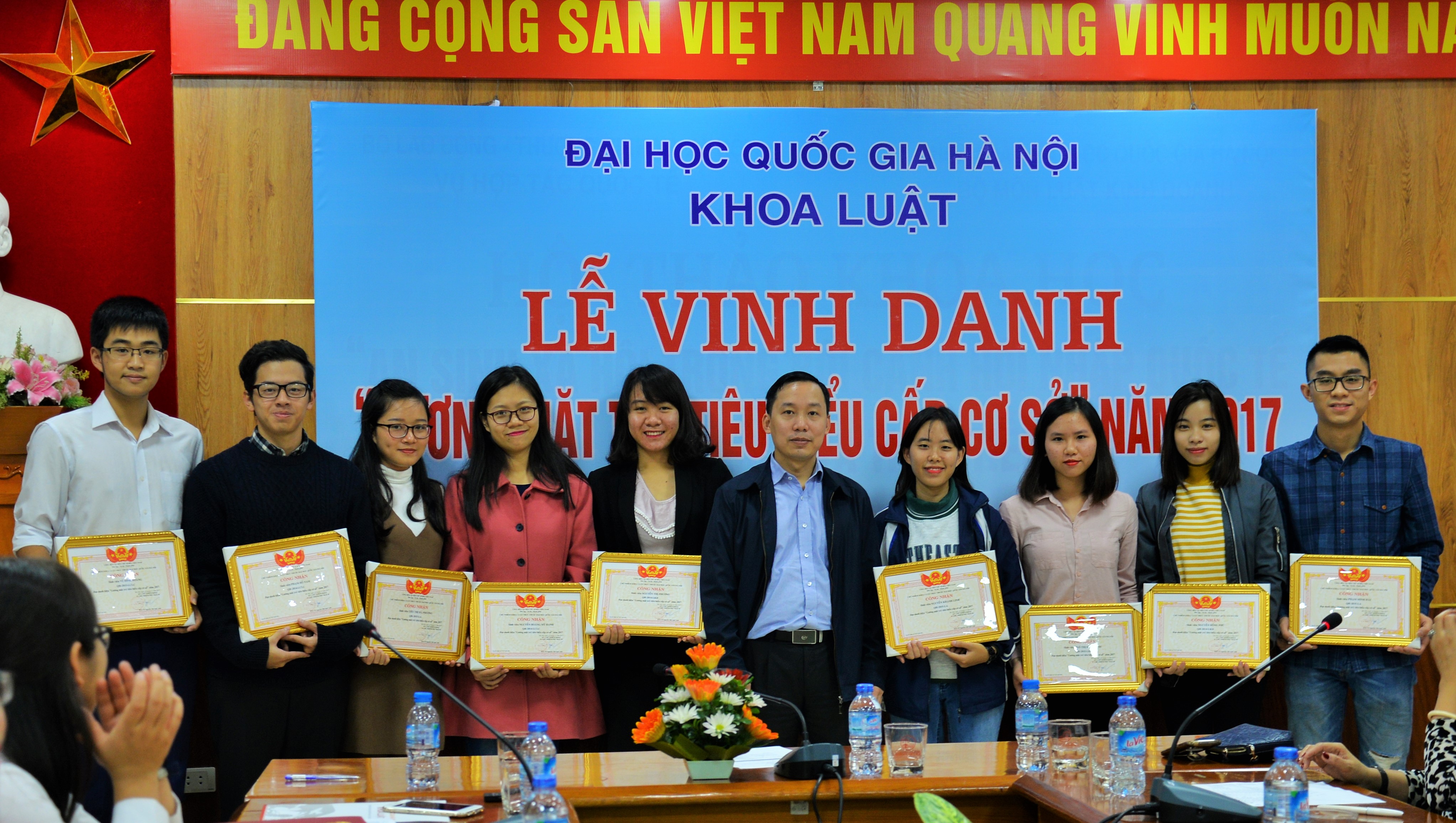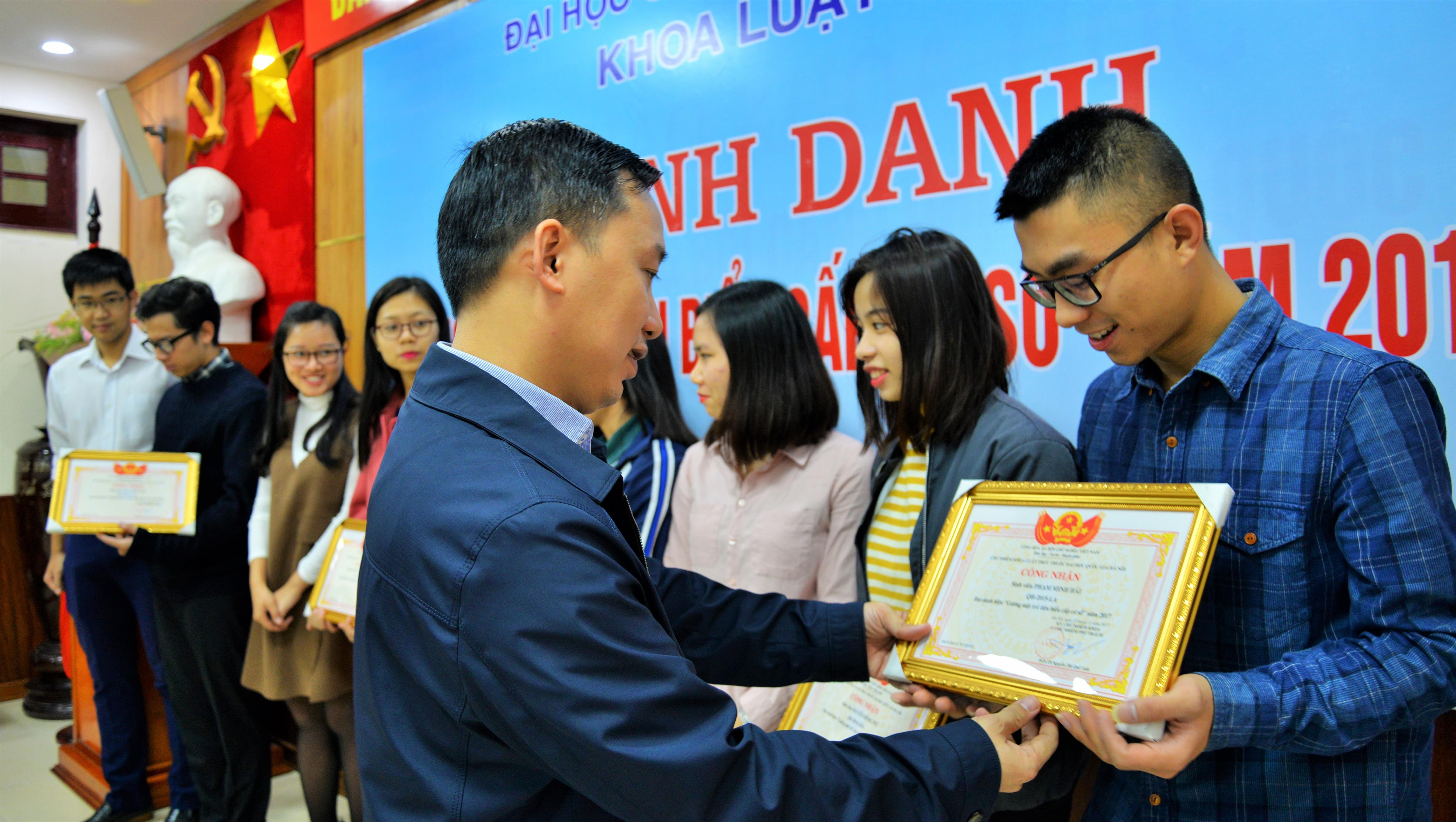 Sáng ngày 29/11/2017, Khoa Luật đã trang trọng tổ chức Lễ vinh danh “Gương mặt trẻ tiêu biểu cấp cơ sở” năm 2017. Tới dự buổi Lễ có TS. Trịnh Tiến Việt – Phó Bí thư Đảng ủy, Phó Chủ nhiệm Khoa, TS. Trần Thu Hạnh – Trưởng phòng Đào tạo và CTHSSV, Chủ tịch Công đoàn Khoa, ThS. Đỗ Thị Bích Nguyệt – Phó Trưởng phòng Đào tạo và CTHSSV cùng các gương mặt sinh viên ưu tú, tiêu biểu nhất có kết quả học tập và rèn luyện xuất sắc trong năm học 2016 – 2017.