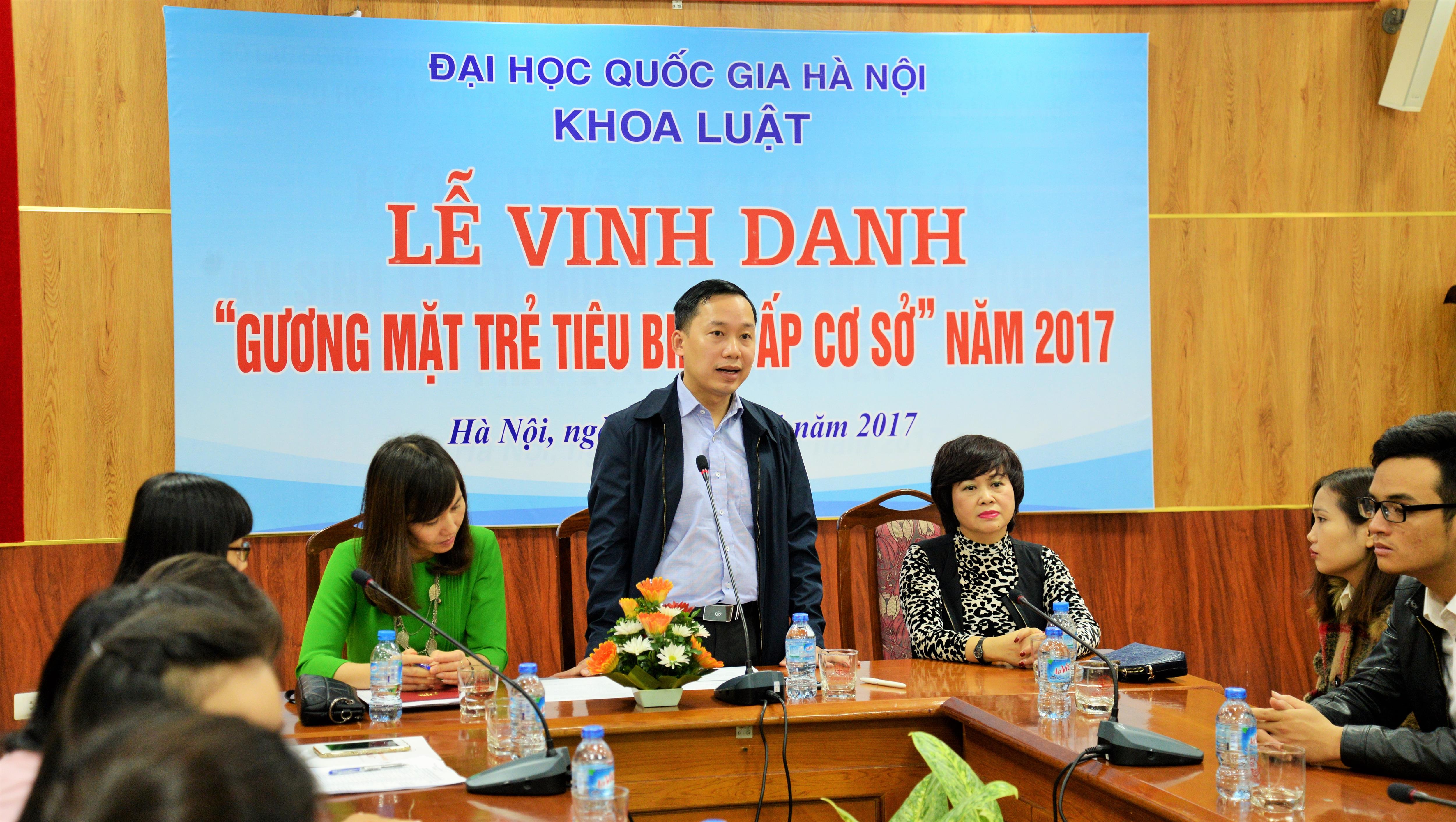 Thay mặt Đảng ủy, Ban Chủ nhiệm Khoa, TS. Trịnh Tiến Việt đã phát biểu chúc mừng 44 sinh viên ưu tú được công nhận là Gương mặt trẻ tiêu biểu của Khoa năm 2017. TS. Trịnh Tiến Việt ghi nhận những nỗ lực vượt qua mọi khó khăn của các sinh viên để cố gắng rèn luyện, phấn đấu đạt kết quả học tập tốt đặc biệt là 02 sinh viên nghèo đã vượt khó đạt kết quả học tập Giỏi và điểm rèn luyện xuất sắc và hi vọng các sinh viên tiếp tục phấn đấu và phát huy tinh thần học tập, rèn luyện hơn nữa để xứng đáng với danh hiệu Gương mặt trẻ tiêu biểu của Khoa và phấn đấu cao hơn để trở thành Gương mặt trẻ tiêu biểu cấp ĐHQGHN và cấp Thành phố.
