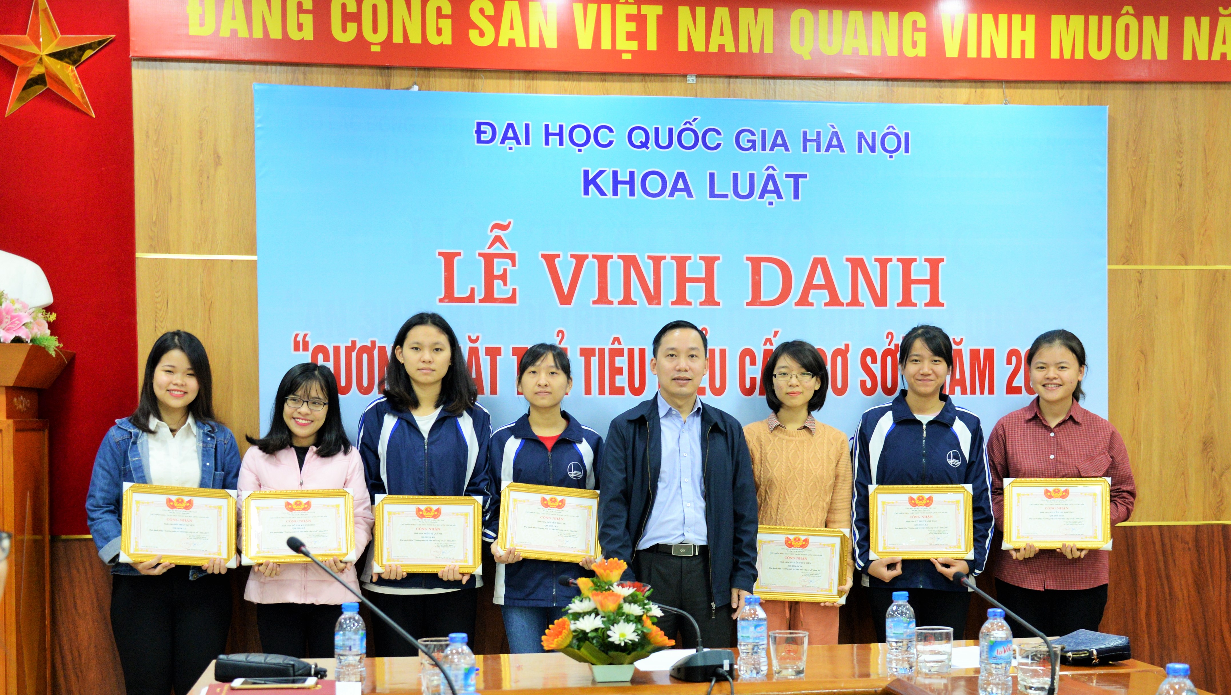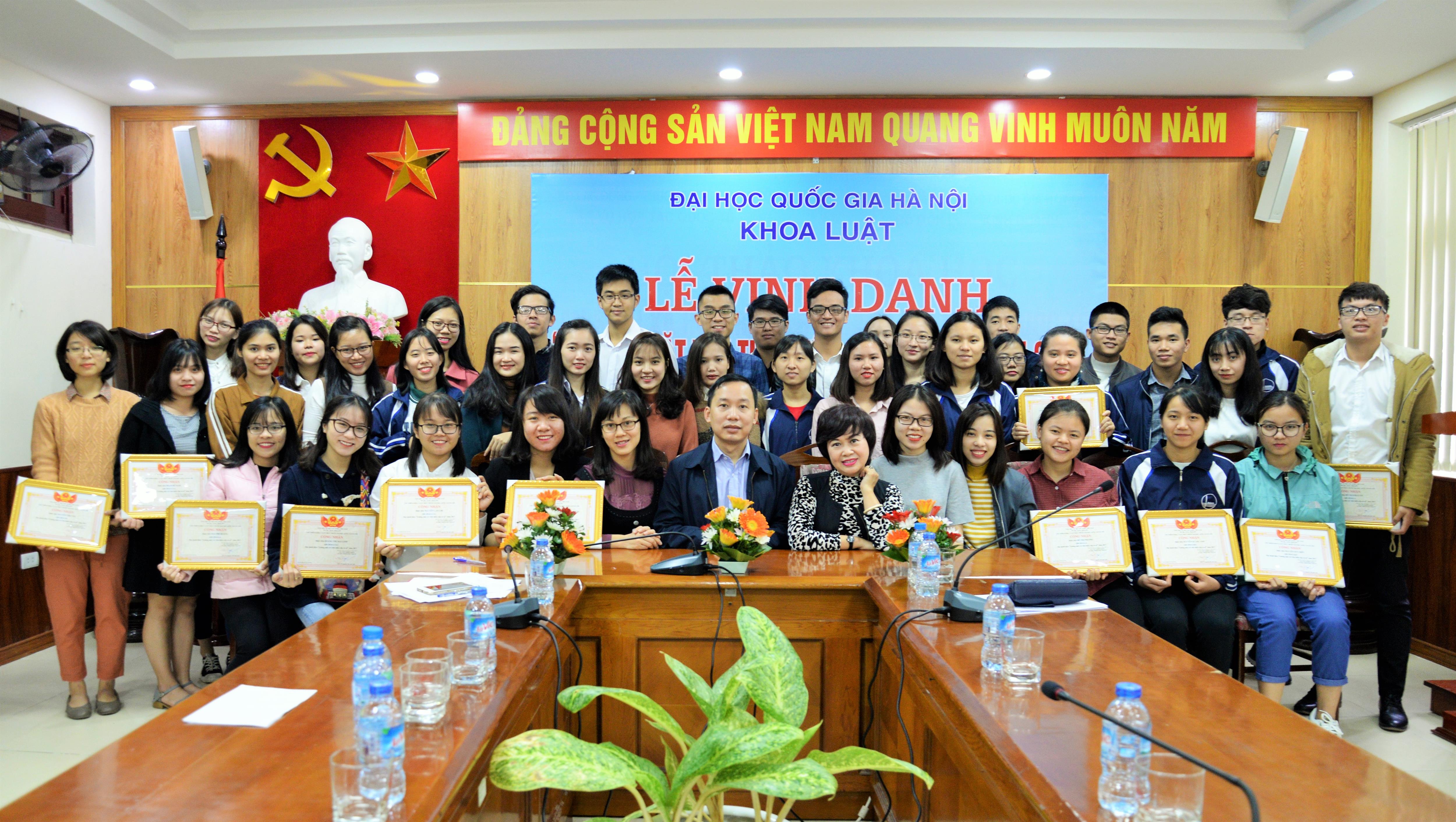 Trong năm qua, phong trào học tập, NCKH, công tác và rèn luyện đạo đức phấn đấu trong tuổi trẻ sinh viên Khoa Luật đã đạt được nhiều thành tựu đáng khích lệ. Lễ tuyên dương hôm nay là dịp hội tụ của 44 gương mặt sinh viên ưu tú nhất được lựa chọn từ hơn 1200 sinh viên của Khoa Luật. Trong đó có, 09 sinh viên chương trình đào tạo chính quy đạt kết quả học tập và rèn luyện xuất sắc năm học 2016 – 2017, 33 sinh viên là cán bộ Đoàn, Hội, cán bộ lớp và 02 sinh viên nghèo vượt khó đạt kết quả học tập giỏi và điểm rèn luyện xuất sắc. Có mặt trong danh sách được tuyên dương ngày hôm nay có bạn vừa là sinh viên xuất sắc vừa là cán bộ lớp, cán bộ Đoàn, cán bộ Hội ưu tú, nhiều bạn đã xuất sắc được nhận học bổng của các tổ chức và cá nhân trong và ngoài nước.