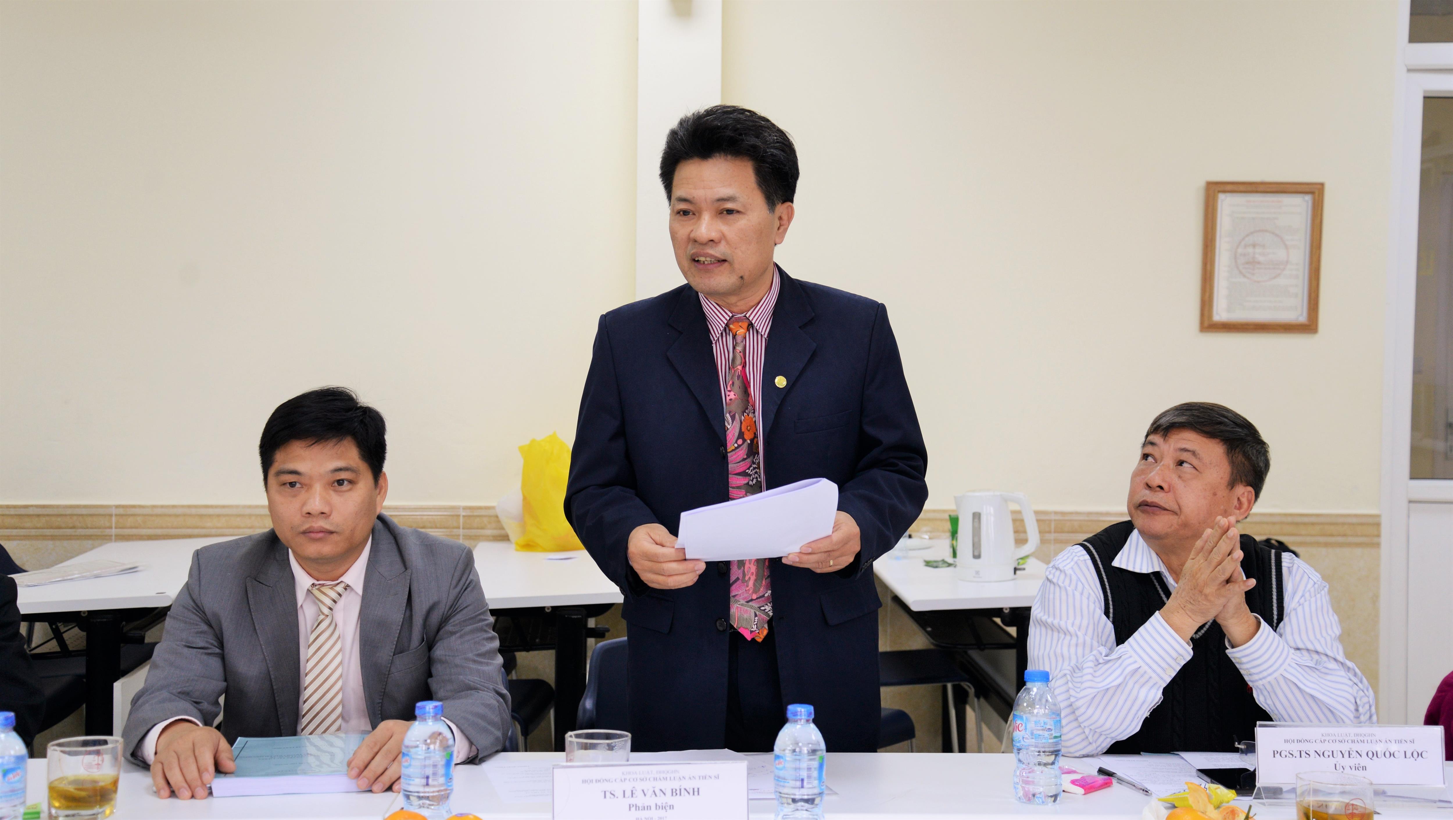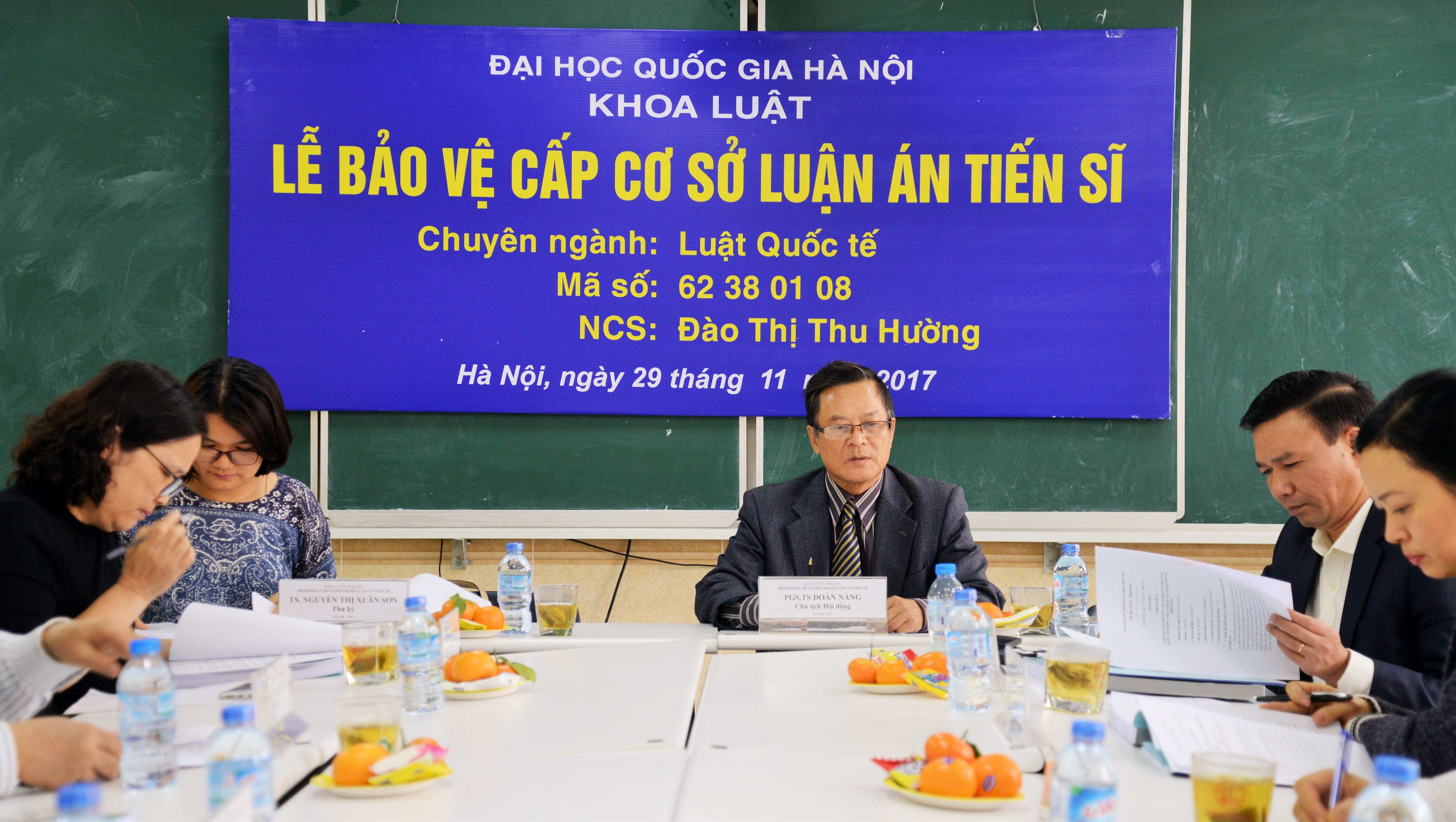 Ngày 29/11/2017, Khoa Luật – Đại học Quốc gia Hà Nội (ĐHQGHN) đã tổ chức bảo vệ luận án tiến sĩ cấp cơ sở cho nghiên cứu sinh (NCS) Đào Thị Thu Hường, chuyên ngành Luật Quốc tế với đề tài: “Áp dụng các nguyên tắc cơ bản của pháp luật quốc tế trong việc giải quyết tranh chấp tại Biển Đông”.