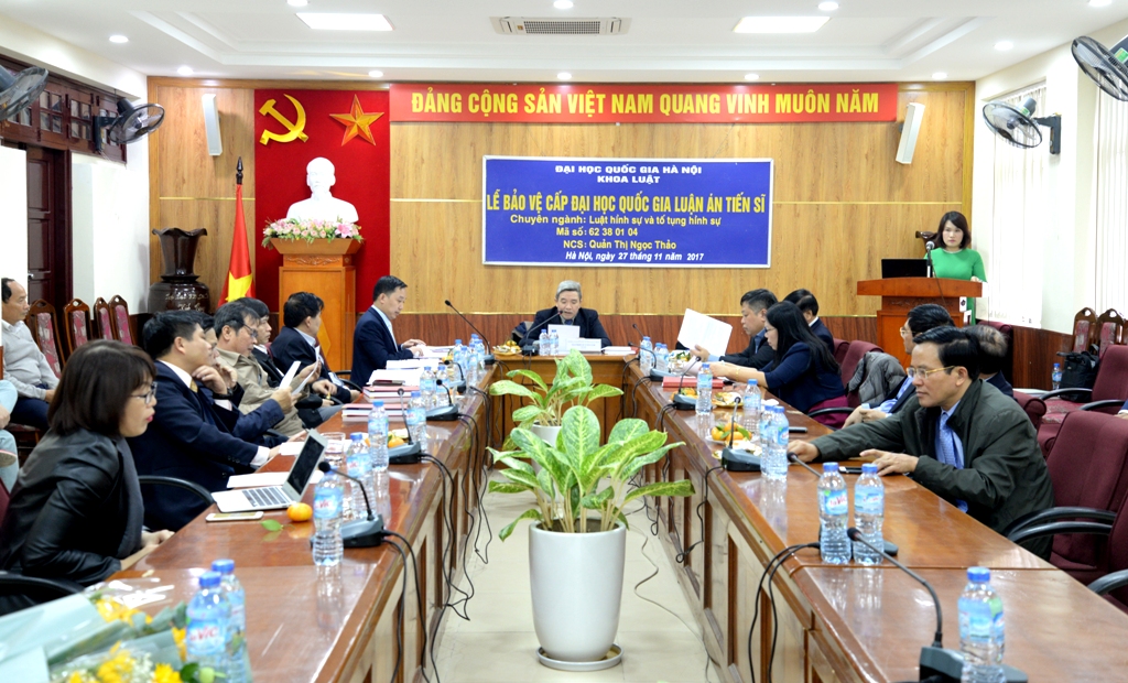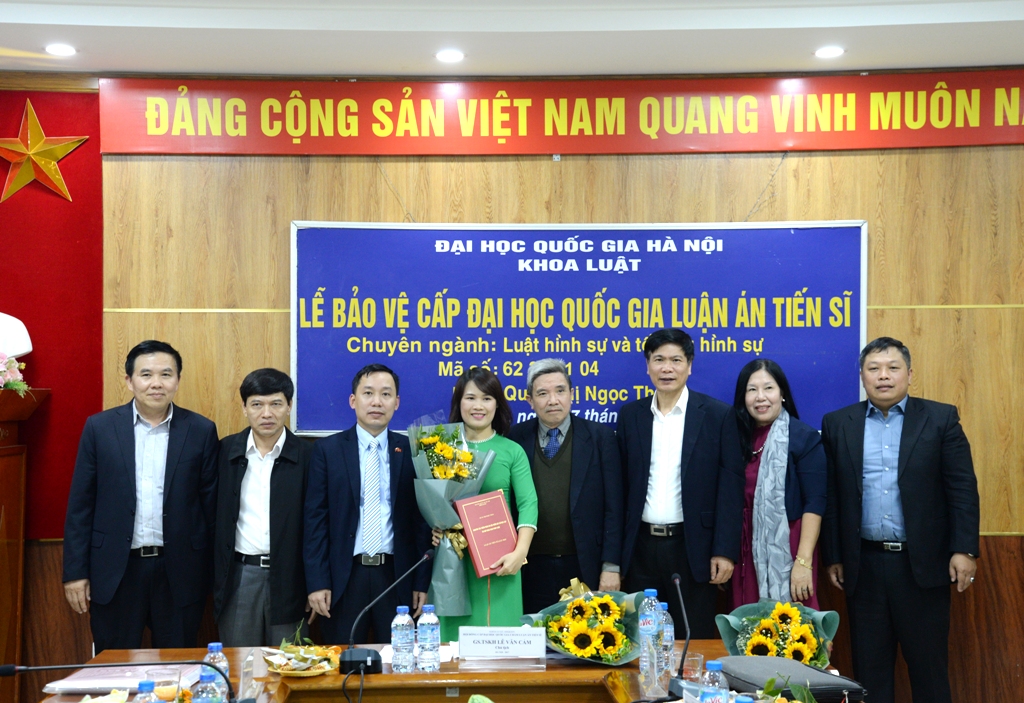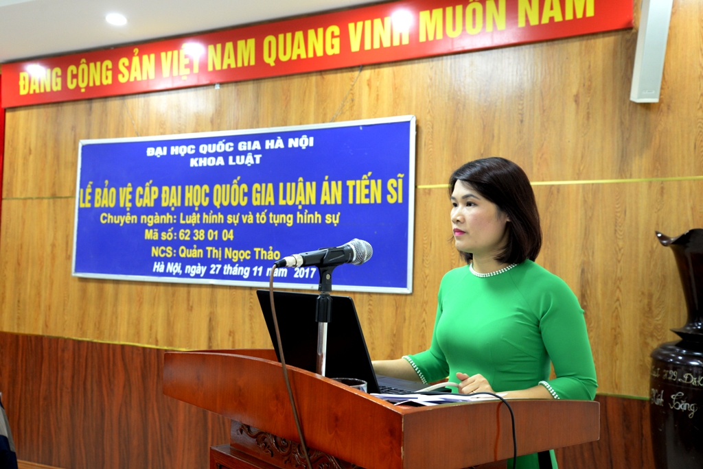 Ngày 27/11/2017, Nghiên cứu sinh (NCS) Quản Thị Ngọc Thảo, chuyên ngành: Luật Hình sự và Tố tụng Hình sự, mã số: 62380104 đã bảo vệ thành công luận án tiến sĩ cấp ĐHQGHN với đề tài “Nguyên tắc thẩm phán và hội thẩm xét xử độc lập và chỉ tuân theo pháp luật”.
