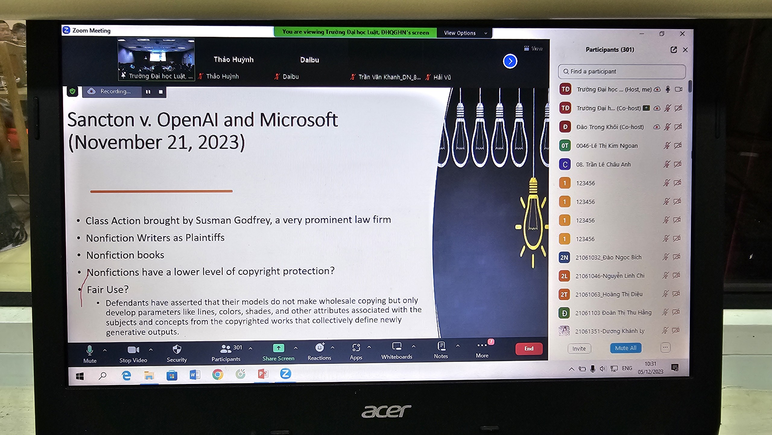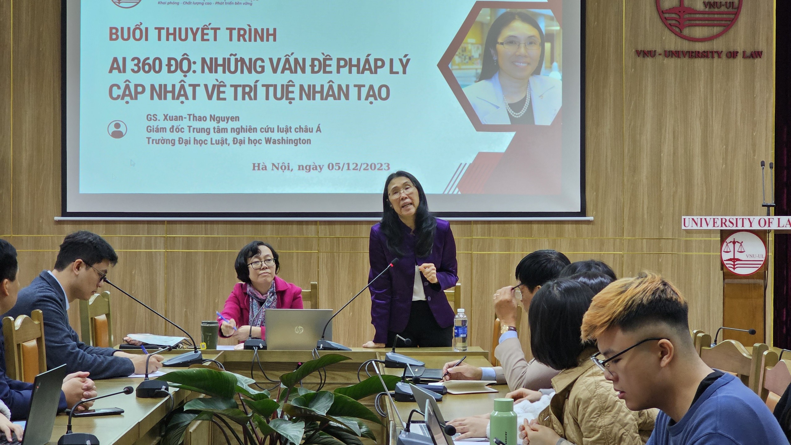 Ngày 05/12/2023, Trường Đại học Luật, ĐHQGHN tổ chức buổi nói chuyện chuyên đề “AI 360 độ: Những vấn đề pháp lý cập nhật về trí tuệ nhân tạo” do GS. Xuan-Thao Nguyen thuyết giảng. Buổi nói chuyện thu hút sự tham gia của khoảng 50 đại biểu tham dự trực tiếp và hơn 300 đại biểu tham dự online qua nền tảng Zoom.