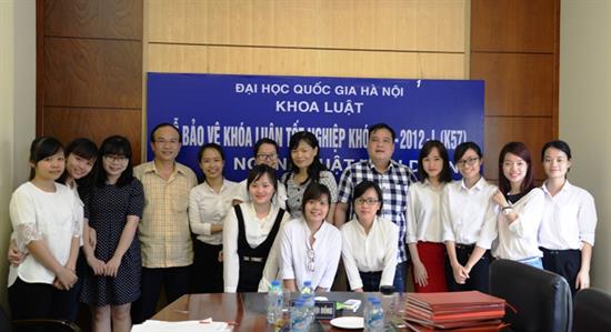 Qua các đề tài khóa luận tốt nghiệp được đưa ra bảo vệ của K57, Hội đồng nhận thấy các em đã vận dụng những kiến thức đã học vào phân tích các vấn đề có tính thời sự, hết sức cấp thiết ở Việt Nam hiện nay như: “Quyền chuyển giới theo pháp luật quốc tế và pháp luật Việt Nam”, “Sự tương tác giữa các nhóm xã hội trong luật Hiến pháp”, “TPP và các yêu cầu đối với bảo đảm các quyền con người trong lĩnh vực lao động ở Việt Nam”, “Hành vi lệch chuẩn và tội phạm – Một số vấn đề lý luận và thực tiễn”, “Sử dụng biện pháp tự vệ thương mại trong bối cảnh Việt Nam tham gia Hiệp định đối tác xuyên Thái Bình Dương ”…nhiệt huyết, sự nỗ lực, niềm đam mê nghiên cứu khoa học cũng như tinh thần học tập của các em đã đem đến những đề tài khóa luận có chất lượng cao, với điểm số trung bình từ 9,0 trở lên, trong đó có nhiều sinh viên đạt điểm 10.