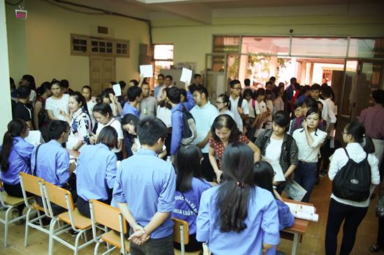 Các tân sinh viên và phụ huynh xếp hàng làm thủ tục nhập học …