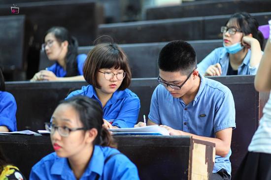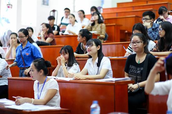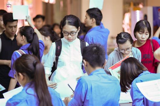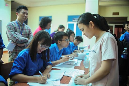 Các tân sinh viên ngồi chờ tới lượt hoàn thiện hồ sơ