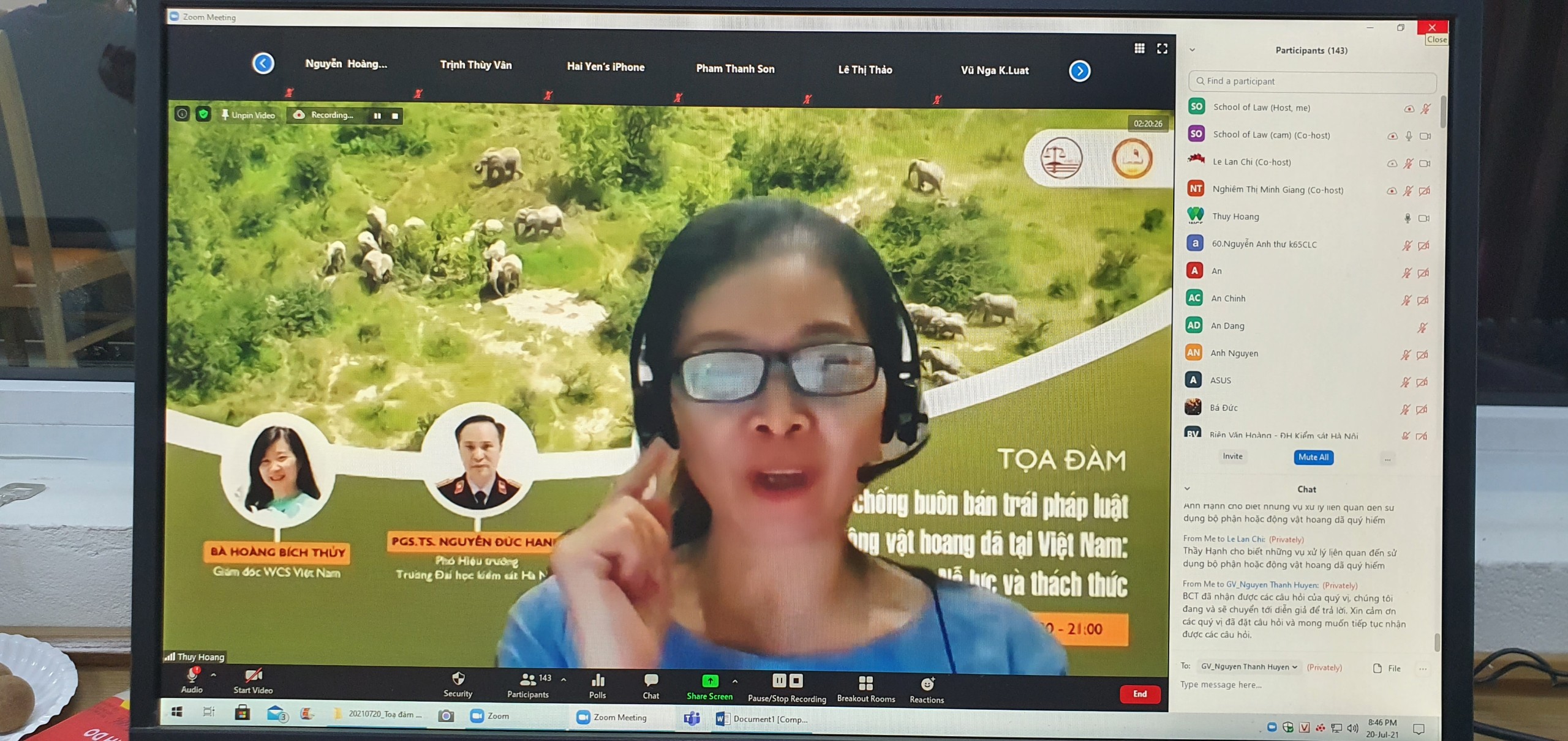Trong khuôn khổ Tọa đàm của Diễn đàn “Legal Talkshow” được phối hợp tổ chức bởi Khoa Luật, Đại học Quốc gia Hà Nội (ĐHQGHN) và Học viện Khoa học xã hội, ngày 20/7/2021, Khoa Luật đã tổ chức Tọa đàm “Phòng, chống buôn bán trái pháp luật động vật hoang dã ở Việt Nam: Nỗ lực và thách thức” bằng hình thức trực tuyến.