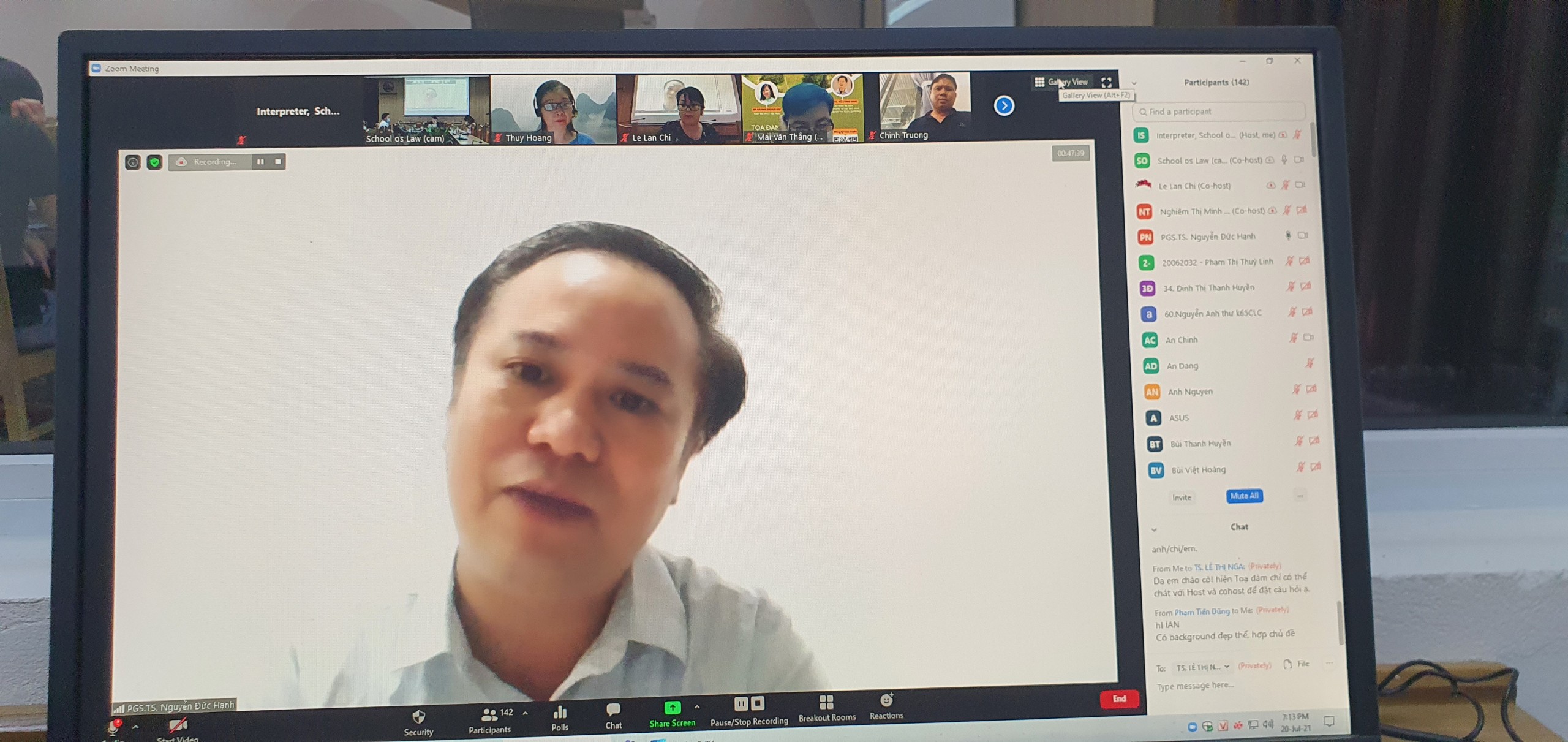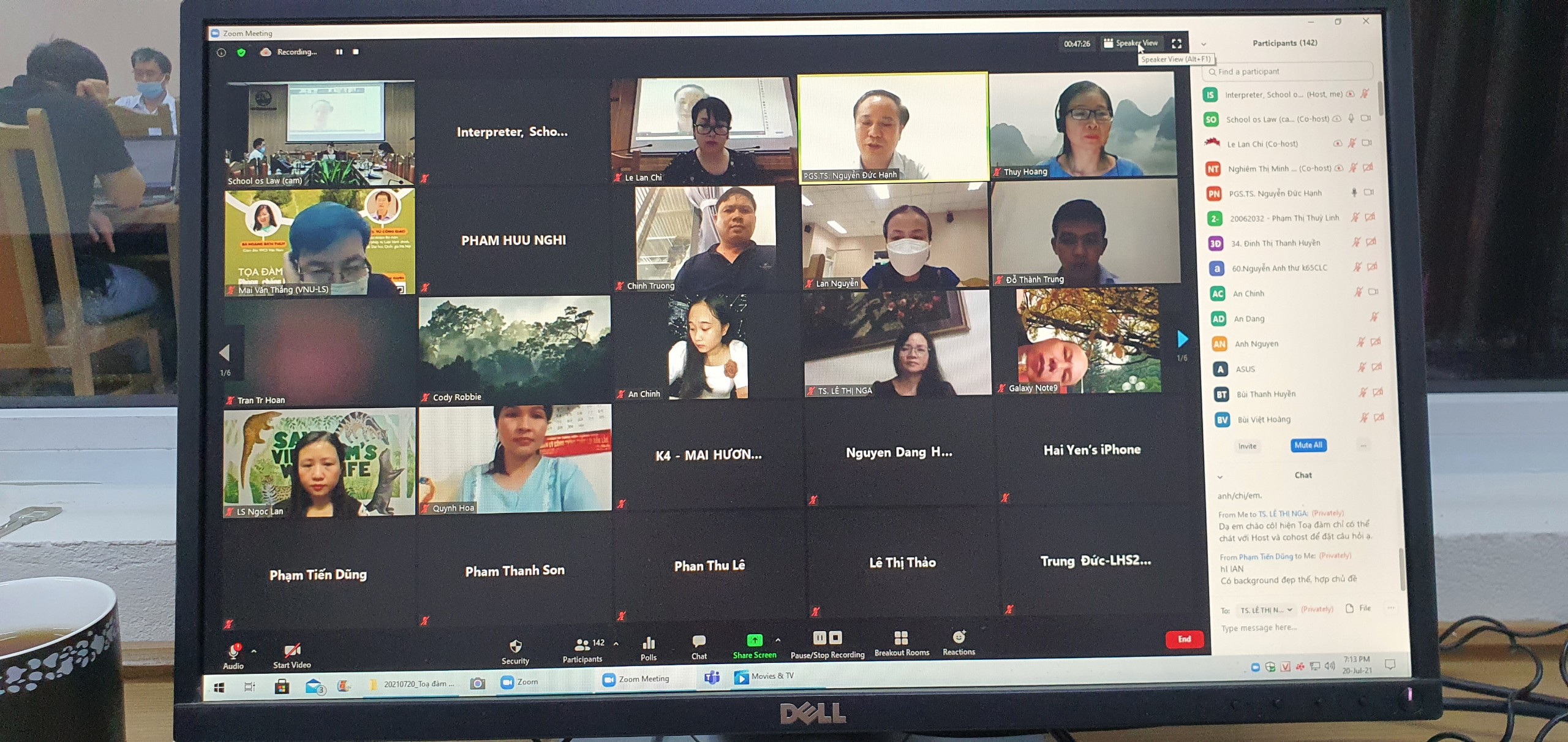 Tọa đàm có sự tham gia của PGS.TS. Nguyễn Thị Quế Anh – Chủ nhiệm Khoa, TS. Lê Lan Chi- Phụ trách BM Tư pháp Hình sự TS. Mai Văn Thắng – Trưởng phòng QLKH&HTPT, Khoa Luật, ĐHQGHN và gần 170 chuyên gia, nhà khoa học, giảng viên, nghiên cứu viên, nghiên cứu sinh, học viên cao học các đơn vị trong cả nước trên nền tảng Zoom.