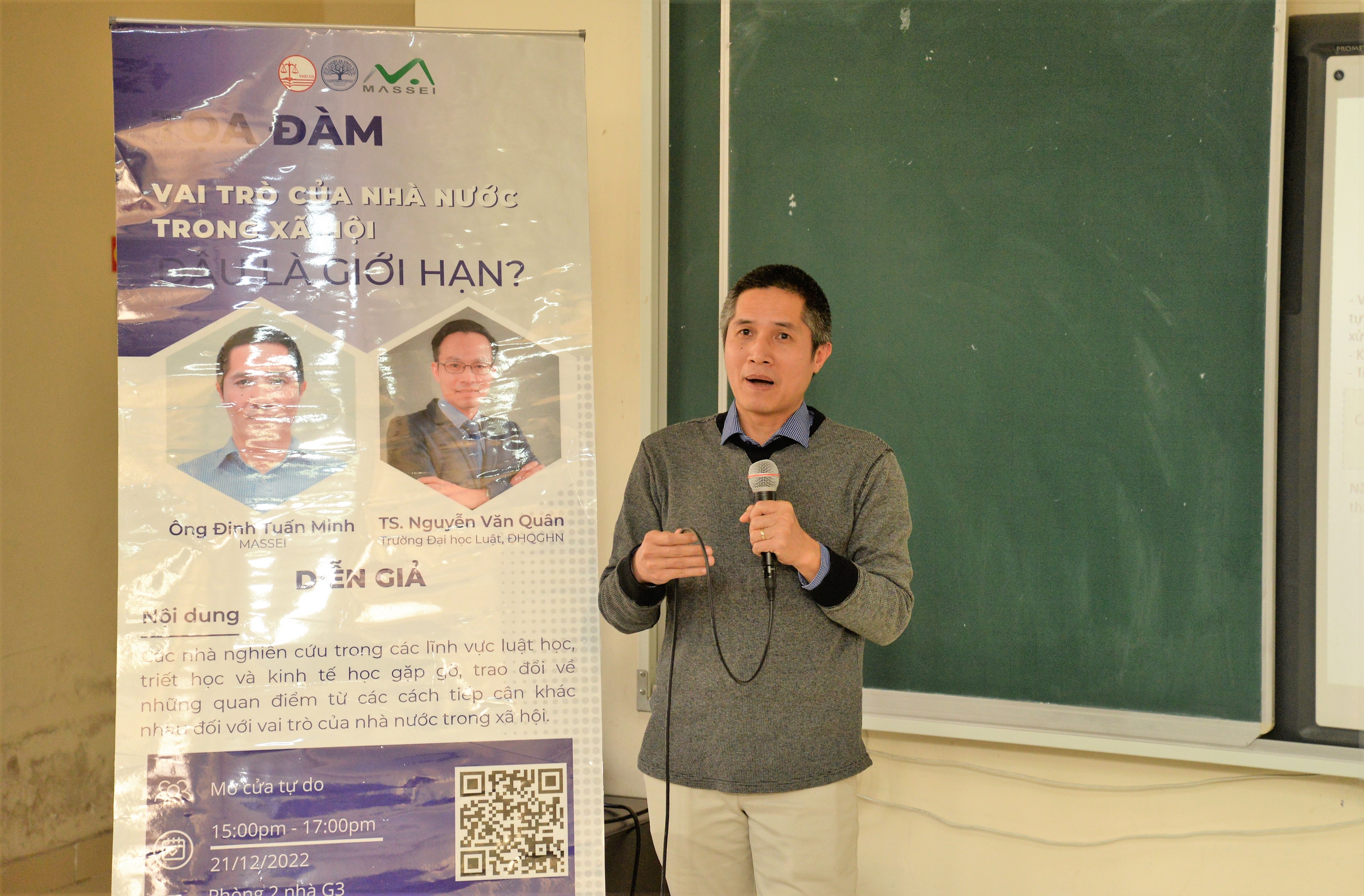 Phần trình bày tiếp theo, TS. Nguyễn Văn Quân đưa ra một số nhận xét và nêu quan điểm dưới góc độ luật học về phần trình bày của TS. Đinh Tuấn Minh, theo ông, điểm tốt của mô hình nhà nước tối thiểu đó là đề cao các quyền tự do cá nhân của con người, tuy nhiên, trong nhiều trường hợp nếu quá đề cao mô hình nhà nước tối thiểu thì sẽ không phát huy được sức mạnh của nhà nước trong các bối cảnh cụ thể ví dụ như trong hoàn cảnh khó khăn như chiến tranh, dịch bệnh, hay phát huy khả năng “mở đường” của nhà nước. Đặc biệt, đối với các quốc gia như Việt Nam rất cần vai trò mở đường của nhà nước bằng cách học hỏi kinh nghiệm của các quốc gia có xuất phát điểm tương tự như Hàn Quốc, Nhật Bản. Tuy nhiên, rõ ràng trong mô hình nhà nước kiến tạo phát triển, đôi khi phải hi sinh một số quyền tự do cá nhân trong một giai đoạn cụ thể để vượt qua giai đoạn khó khăn sau đó mới tiến hành quá trình dân chủ hoá.