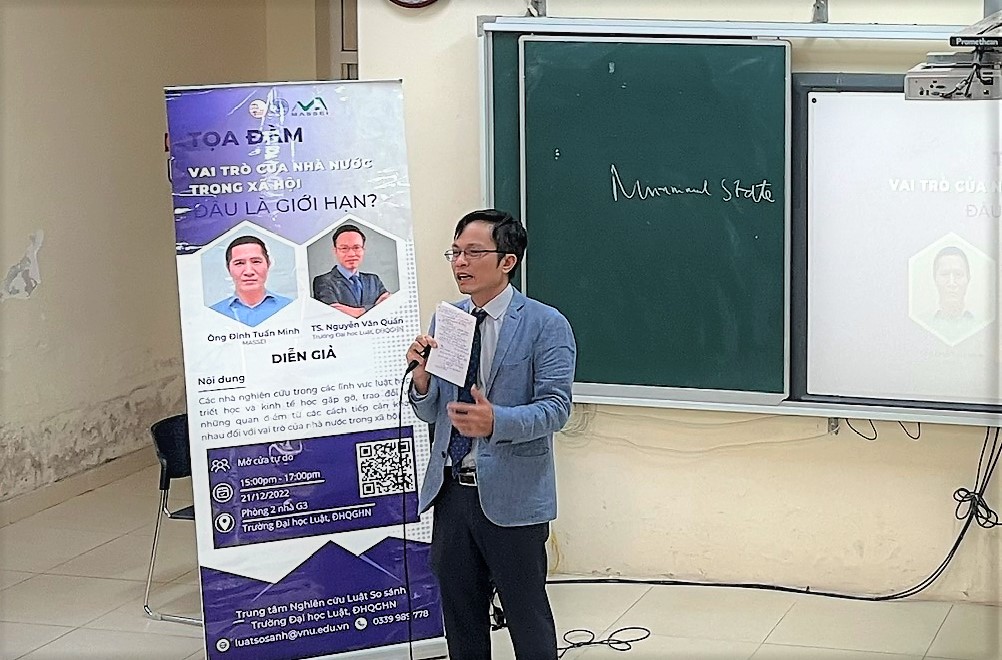 Ngày 21/12/2022, Trung tâm Nghiên cứu Luật So sánh, Trường Đại học Luật, Đại học Quốc gia Hà Nội (ĐHQGHN) tổ chức buổi toạ đàm “Vai trò của nhà nước trong xã hội – Đâu là giới hạn”. Buổi toạ đàm được tổ chức tại Phòng 2 – toà nhà G3, Trường Đại học Luật, ĐHQGHN.