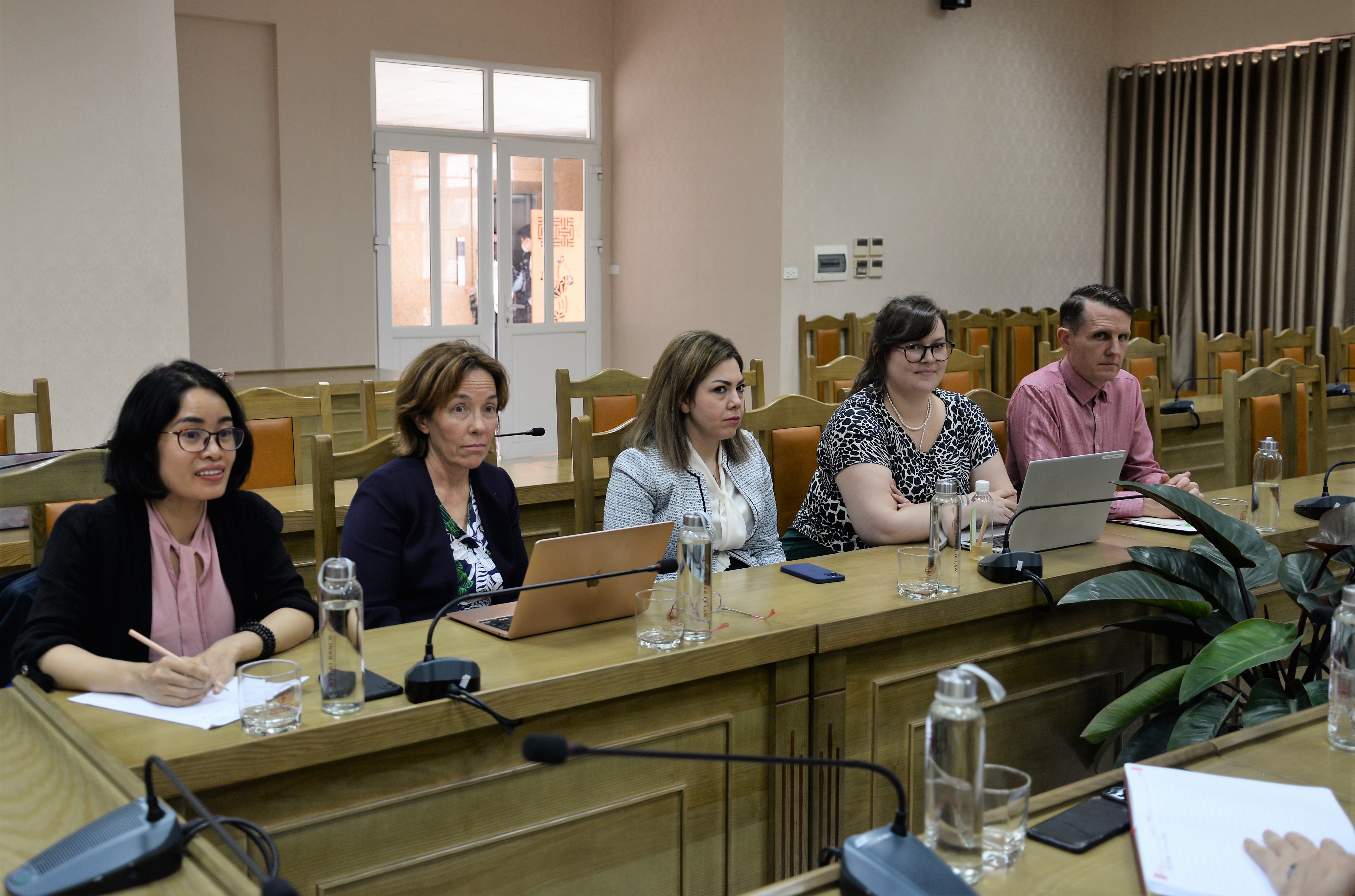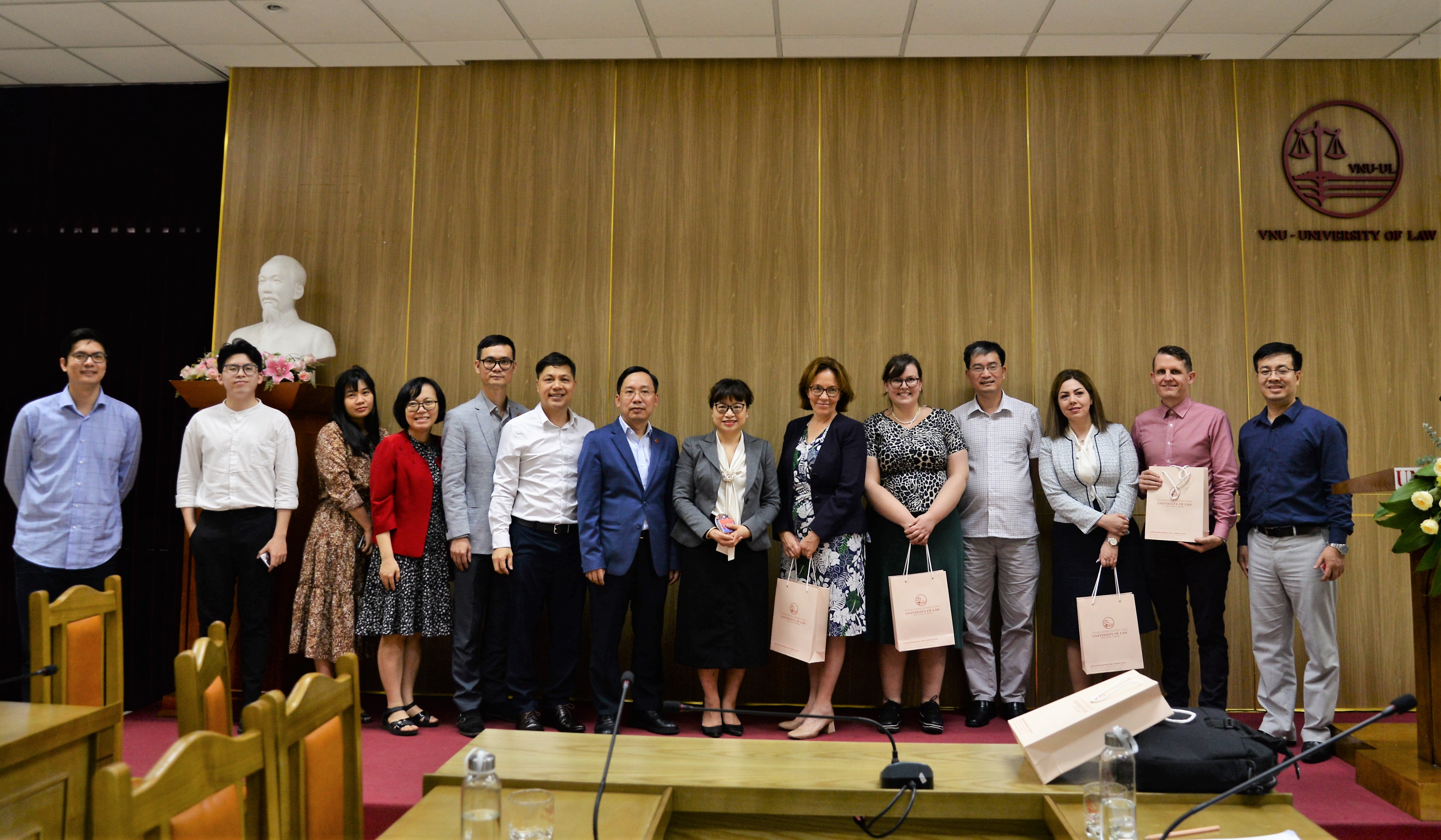 Tham gia tiếp đón và làm việc có PGS.TS. Nguyễn Thị Quế Anh – Hiệu Trưởng, PGS.TS. Trịnh Tiến Việt – Phó Hiệu trưởng, TS. Mai Văn Thắng – Trưởng Phòng QLKH&HTPT, TS. Nguyễn Bích Thảo – Chủ nhiệm Khoa Luật Dân sự, PGS.TS. Vũ Công Giao – Giám đốc Trung tâm Nghiên cứu quyền con người và quyền công dân, PGS.TS. Bùi Tiến Đạt – Phó Trưởng phòng QLKH&HTPT, TS. Đỗ Giang Nam – Phó Chủ nhiệm Khoa Luật Dân sự.