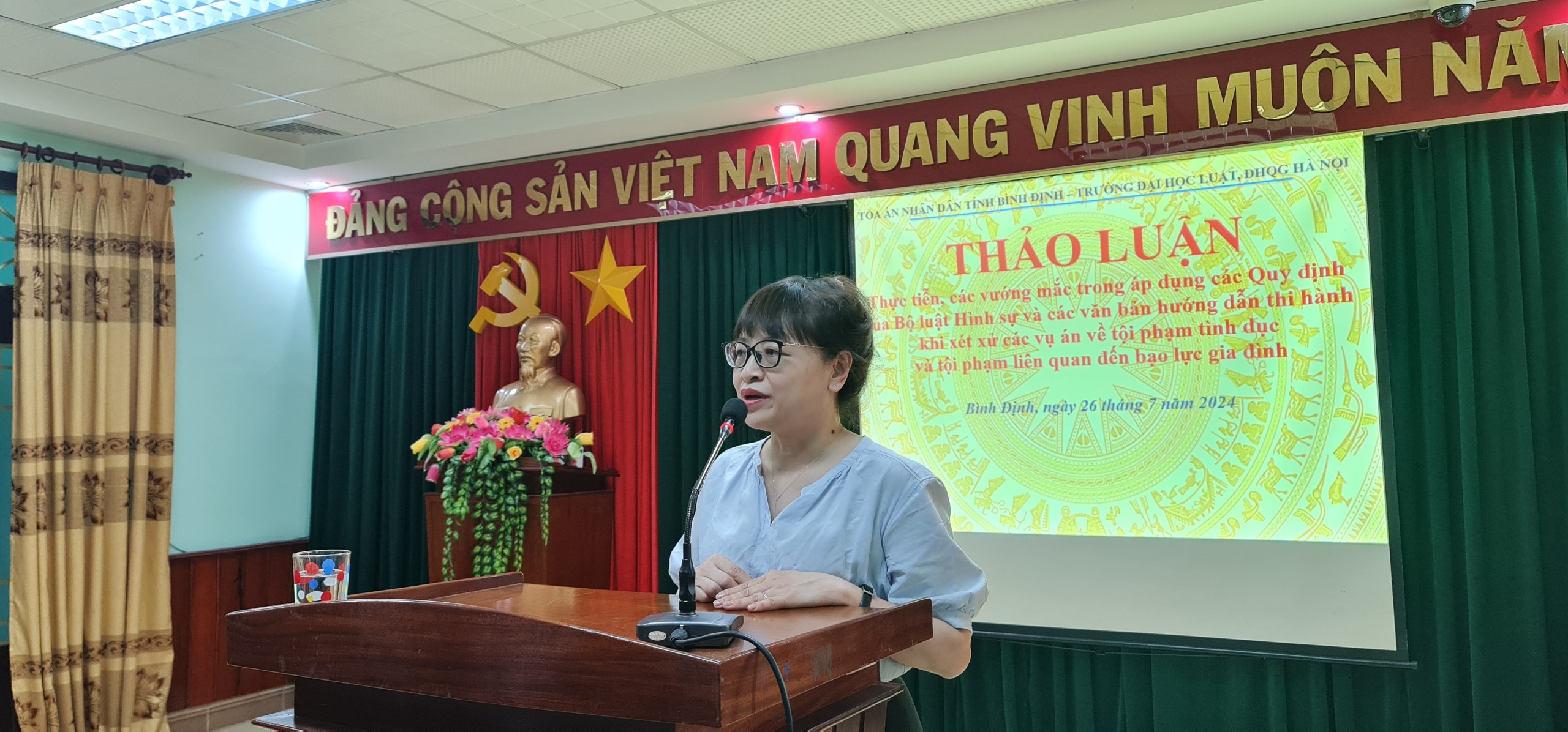 Phát biểu chào mừng tại buổi làm việc, Chánh án Tòa án nhân dân tỉnh Bình Định đã cảm ơn Đoàn Công tác đã chọn Bình Định là điểm thăm và làm việc và cho rằng đây cũng là cơ hội quý để các thẩm phán chia sẻ về những khó khăn, vướng mắc trong quá trình xử lý các vụ việc trên thực tiễn, đặc biệt là các vụ việc liên quan đến bạo lực trên cơ sở giới để từ có cho những trao đổi với giới nghiên cứu hàn lâm để tìm ra những giải pháp tháo gỡ.